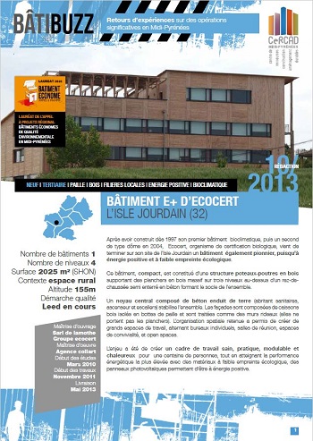 Fiche BâtiBuzz de retour d’expérience sur un bâtiment pionner en Midi-Pyrénées : la construction de bureaux isolés en paille et à énergie positive pour le siège social d’Ecocert.
