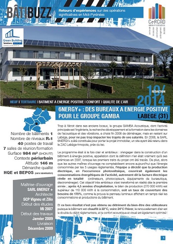Fiche BâtiBuzz de retour d’expérience sur la construction du nouveau siège du groupe Gamba Acoustique à Labège, bâtiment à énergie positive « toutes activités comprises ».