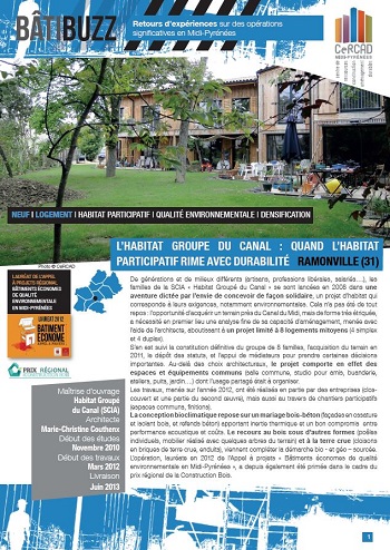Nouvelle fiche BâtiBuzz de retour d’expérience sur cette opération d’habitat participatif de 8 logements, lauréate en 2012 de l’Appel à projets « Bâtiments économes de qualité environnementale en Midi-Pyrénées » et primée dans le cadre du prix régional de la Construction Bois.