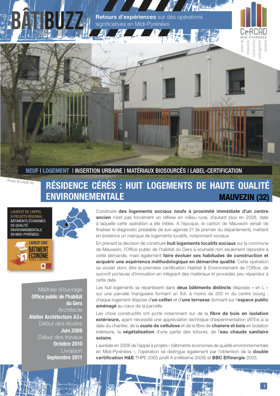 Nouvelle fiche BâtiBuzz portant sur l’analyse multicritères d’une opération lauréate en 2008 de l’appel à projet « bâtiments économes de qualité environnementale en Midi-Pyrénées » : les logements sociaux de Mauvezin, construits à proximité immédiate du centre ancien selon une double démarche de certification énergétique et environnementale.