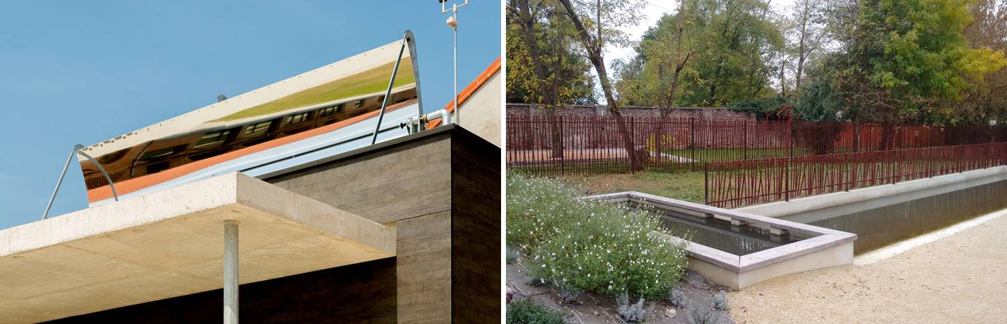 - Toiture existante : charpente bois refaite avec conservation des fermes existantes, toiture refaite. Isolation laine de roche. Neuve : toiture terrasse végétalisée, isolation liège et polyuréthane.