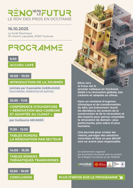 Envirobat Occitanie, en partenariat avec la Région Occitanie et l’ADEME, vous invite à la 1re édition de Réno vers le Futur, le rendez-vous des professionnels de la rénovation en Occitanie.