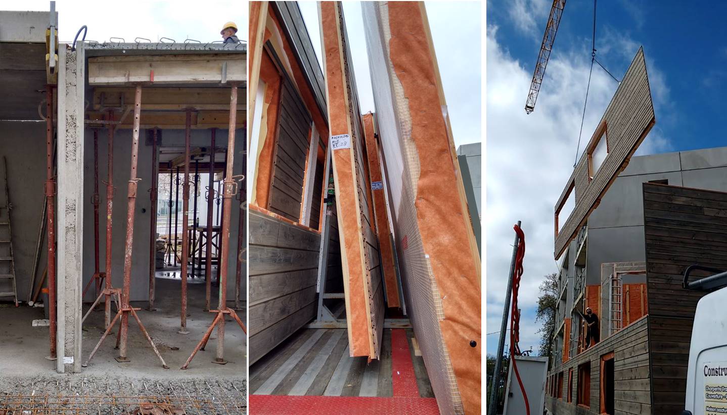 Du fait d’être sur une parcelle occupée, la préfabrication a été un critère de choix pour éviter de trop lourdes installations de chantier, aussi bien pour la structure porteuse en béton que pour les façades en ossature bois.