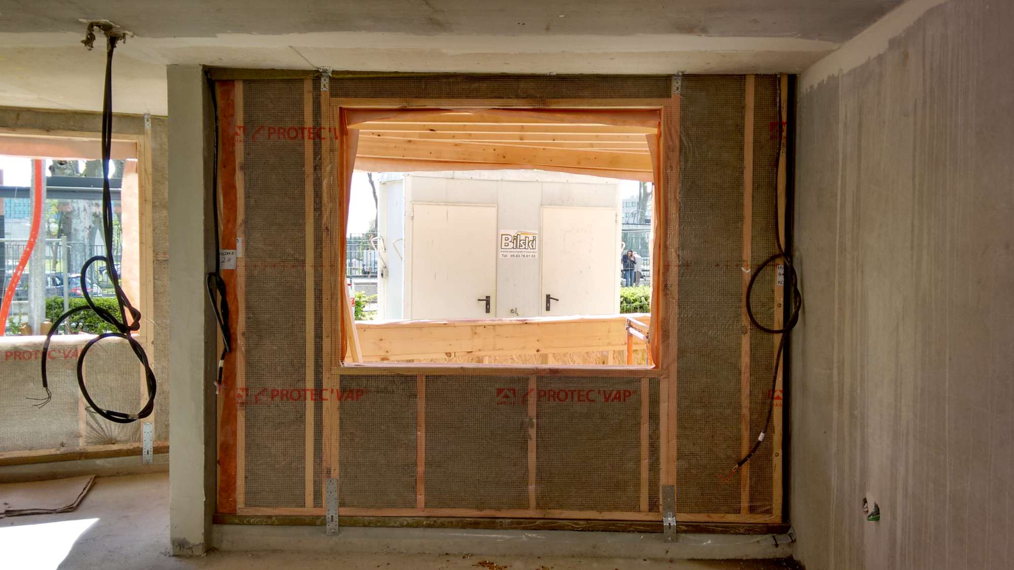 - bâtiment B : suivant parois, béton bilame à isolation par l’extérieur 12 cm ou ossature bois isolée par 20 cm de laine de roche (12 cm entre ossature et 8 cm en doublage intérieur).