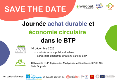 Rendez-vous pour la première journée achat durable et économie circulaire dans le BTP organisée par RES’OCC, Envirobat Occitanie et Alès Myriapolis.