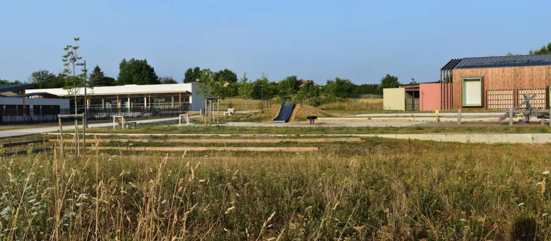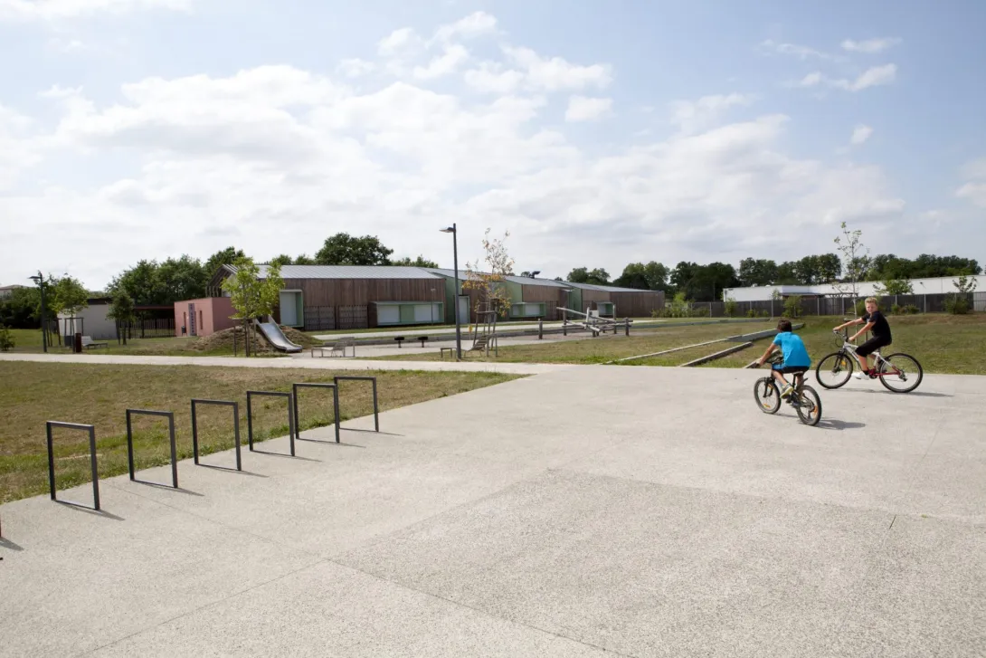 Au croisement des déplacements, mouvements quotidiens, les maîtres d’œuvre proposent un lieu où se poser, prendre l’air, jouer, faire du sport, pique-niquer. Ils créent un espace public de cœur de quartier, à la fois place publique, parc, aire de jeux et de loisirs. Pour ce faire, la partie centrale a été aménagée en prairie en terrasses, des jeux d’enfants et des tables de pique-niques installés. Les voies desservant le secteur, étroites routes de campagne inadaptées à l’augmentation du trafic, ont été repensées (emprise réduite de la chaussée, valorisation des cheminements piétons, plateau traversant…). Le projet est le fruit d’une recherche d’équilibre entre place de la voiture, place de la nature, gestion de l’eau.