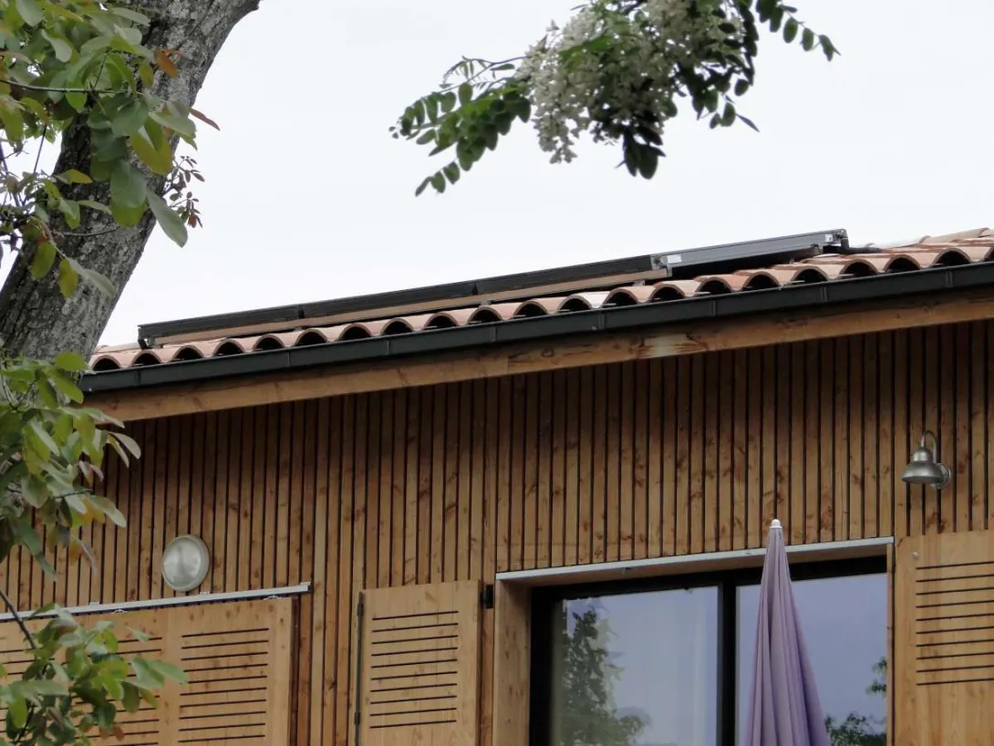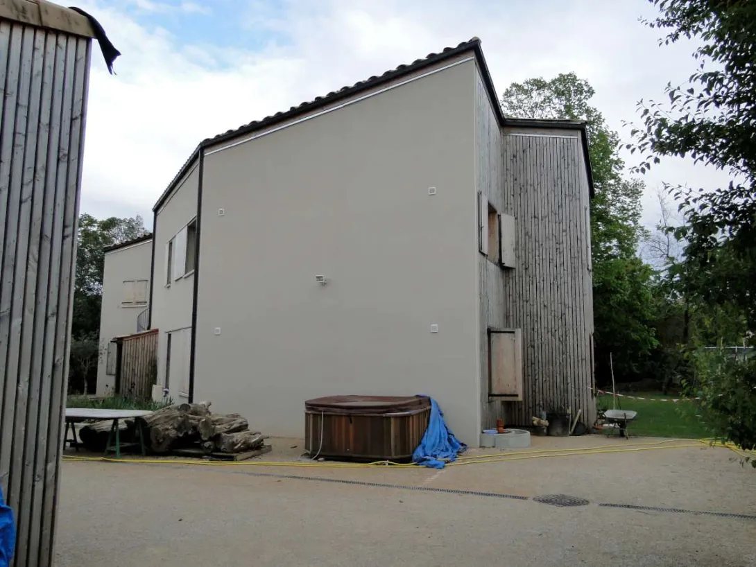 - Toiture : tuiles canal, écran de sous-toiture réflecteur, charpente traditionnelle en lamellé collé, isolation de 300 mm en laine de bois (Uparoi = 0,155 W/m².K), faux-plafond rampant en plaques de plâtre.
