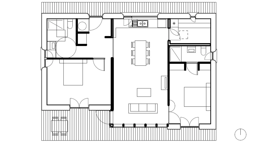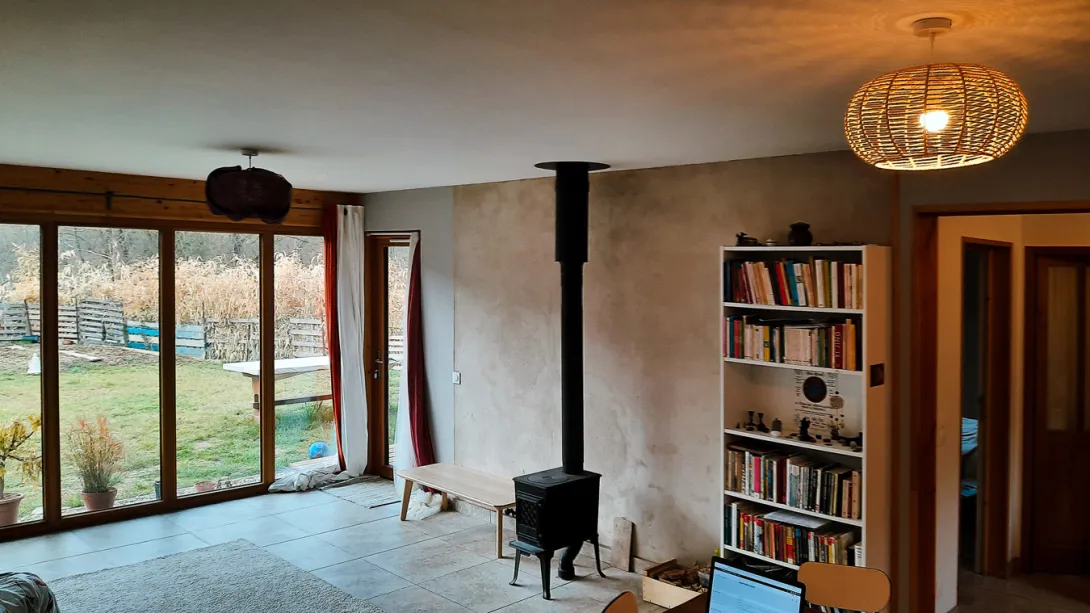 Divers équipements complètent la conception : un poêle à bois pour le confort thermique, un capteur solaire pour l’eau chaude sanitaire et des cuves de récupération pour les eaux pluviales.