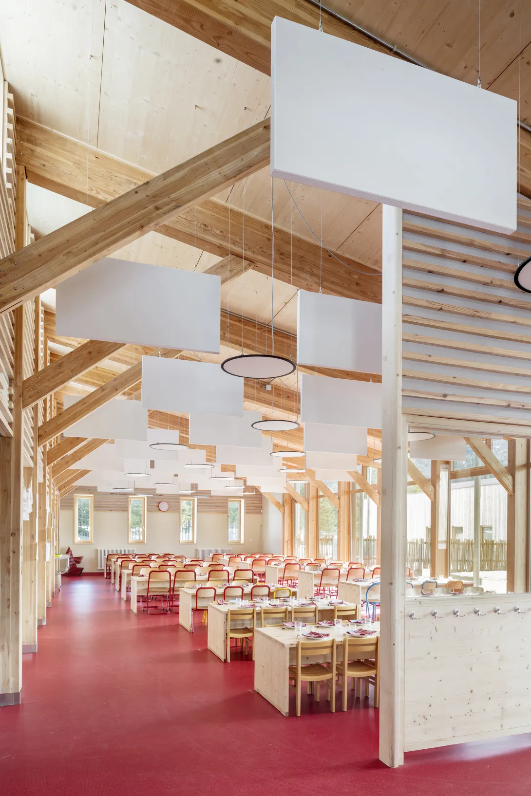 Les bâtiments sont tous de plain-pied et conçus de façon bioclimatique, avec une volumétrie simple au nord pour les espaces servants et noble au sud pour les espaces de vie. Les matériaux utilisés sont majoritairement biosourcés (ossature bois et charpente en douglas régional, panneaux bois lamellés-croisés en épicéa, isolation paille et fibre de bois). Une chaudière bois alimente l’ensemble des bâtiments et une production photovoltaïque est installée en toiture du gymnase.