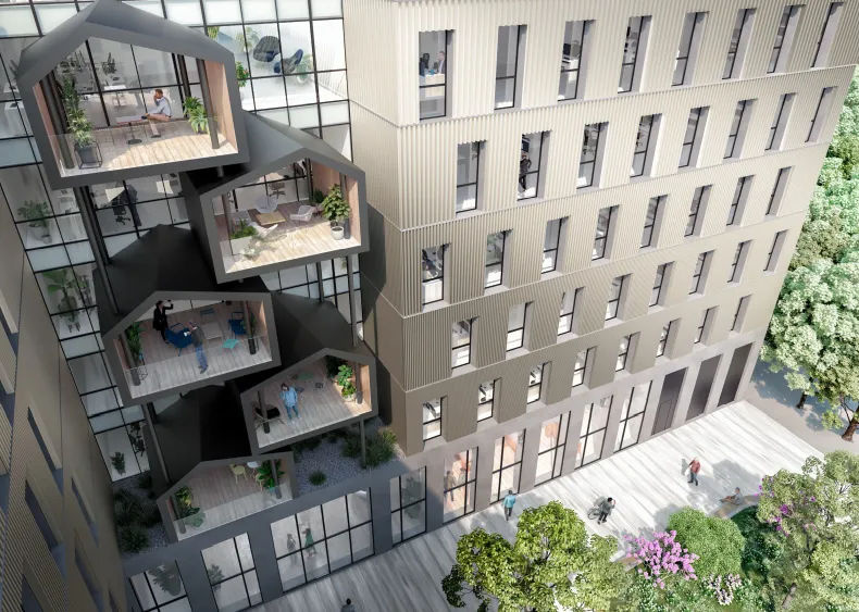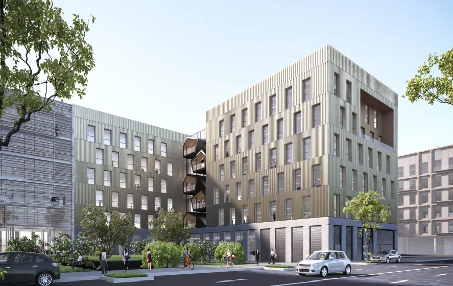 Le projet s’est fixé des exigences de performances supérieures à celles du quartier en visant le niveau carbone C2 grâce notamment à l’utilisation de bois en structure (CLT). Côté énergie, il prévoit l’installation d’un système photovoltaïque en toiture et une connexion aux réseaux de chaleur et de froid.