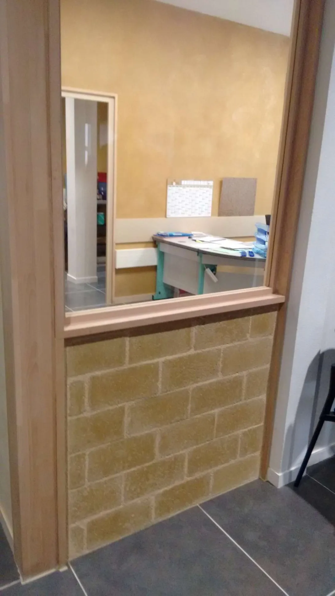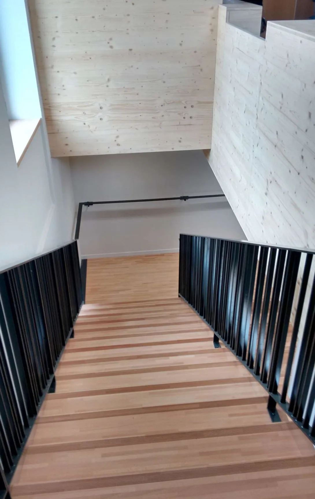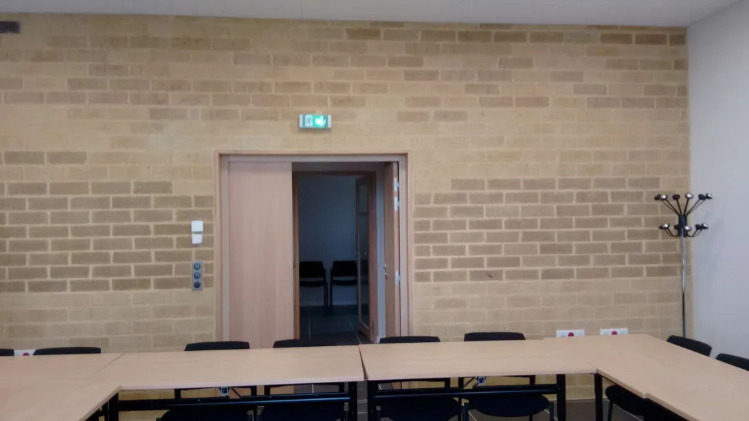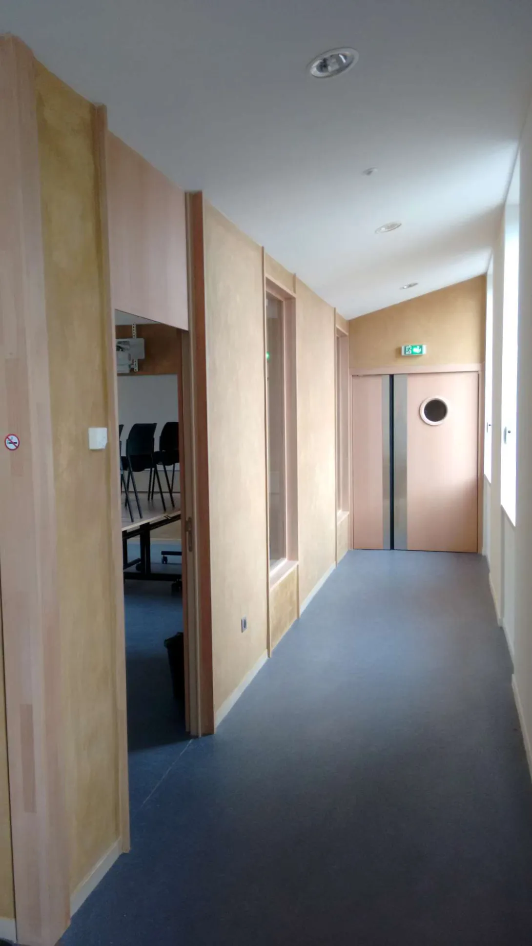 A l’étage, des tuyaux d’eau sont intégrées sur chacune des faces de ces cloisons, afin de chauffer, séparément ou concomitamment, les espaces de circulation et les salles de réunion.