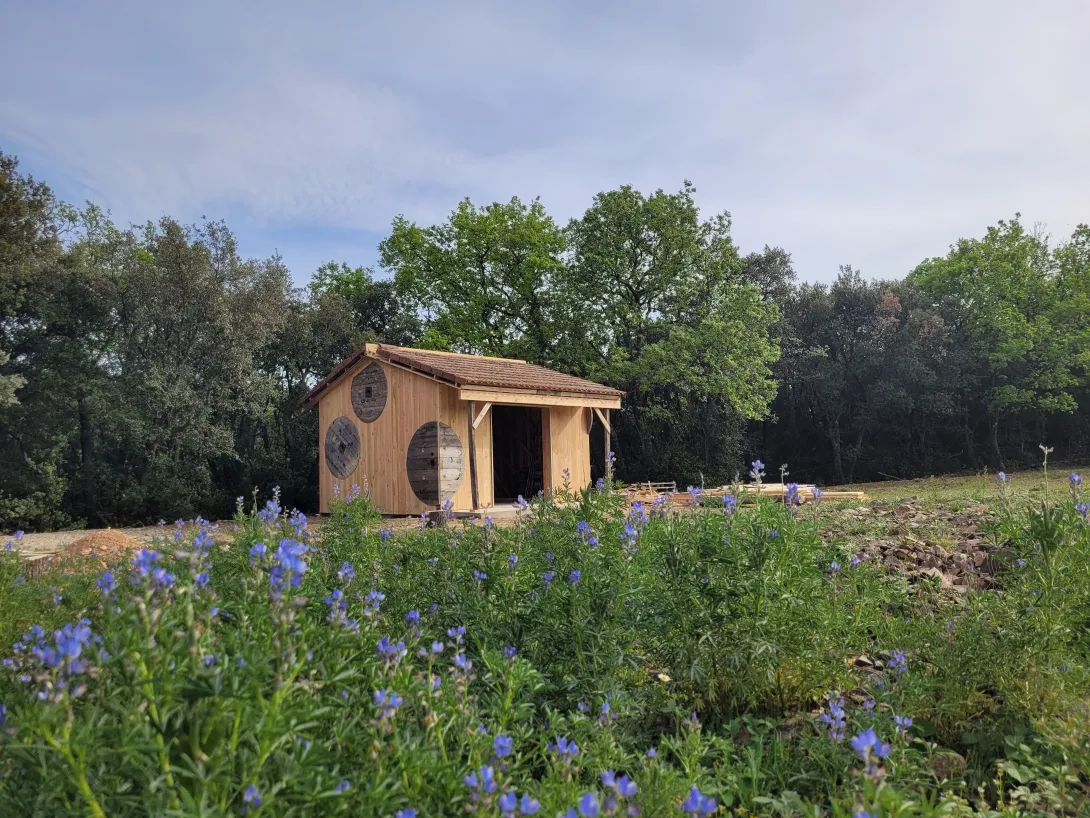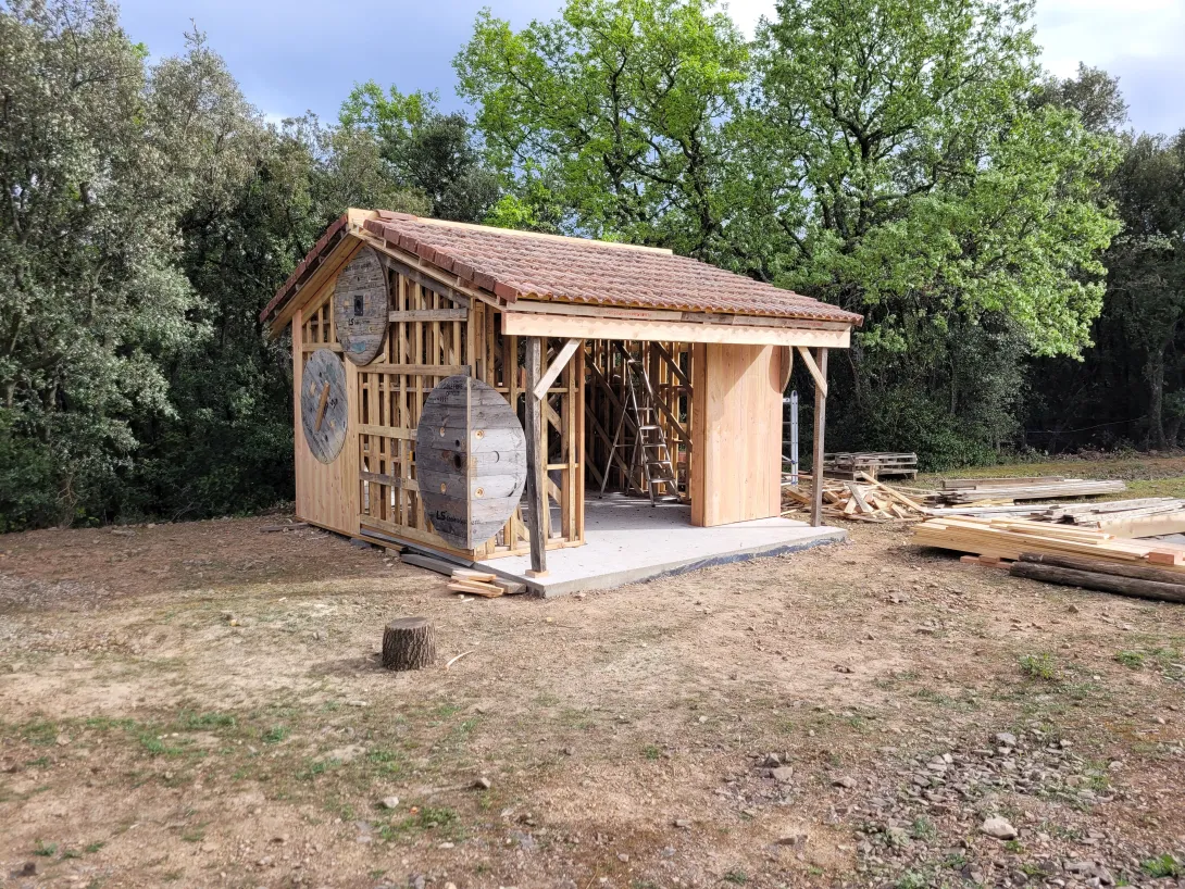 - Les tuiles de la toiture proviennent d’un chantier de déconstruction de chalets en bois réalisés quelques mois plus tôt à aux alentours de Lodève.