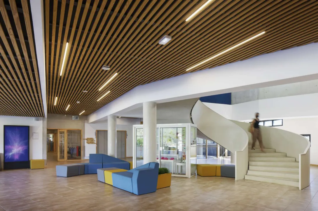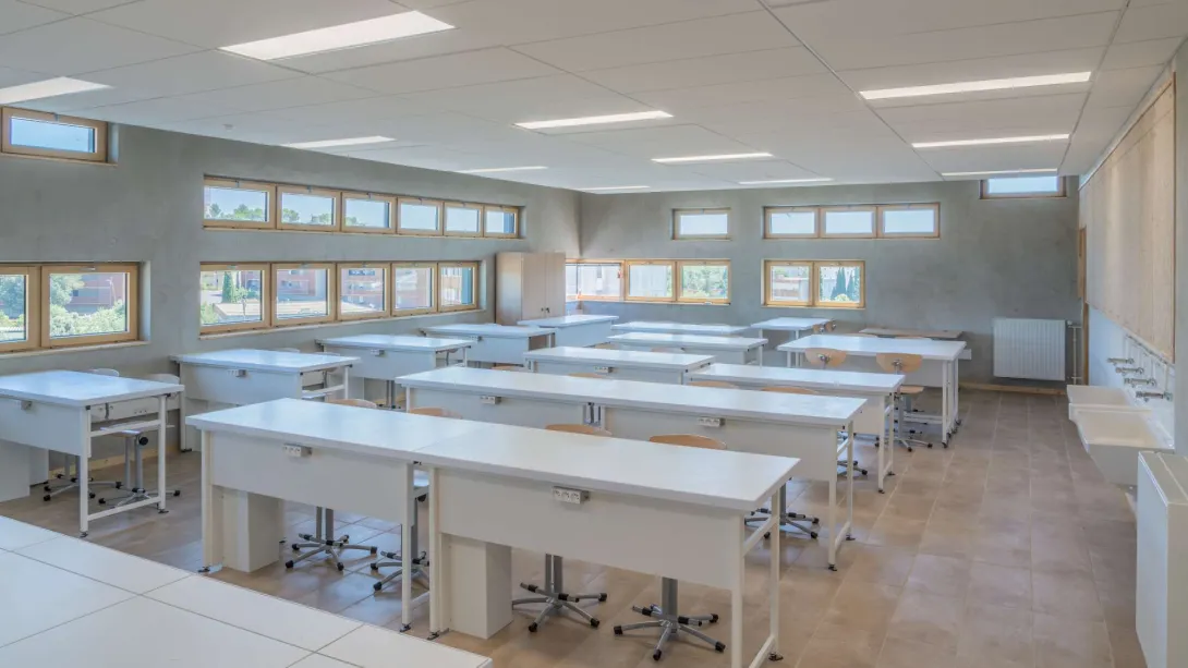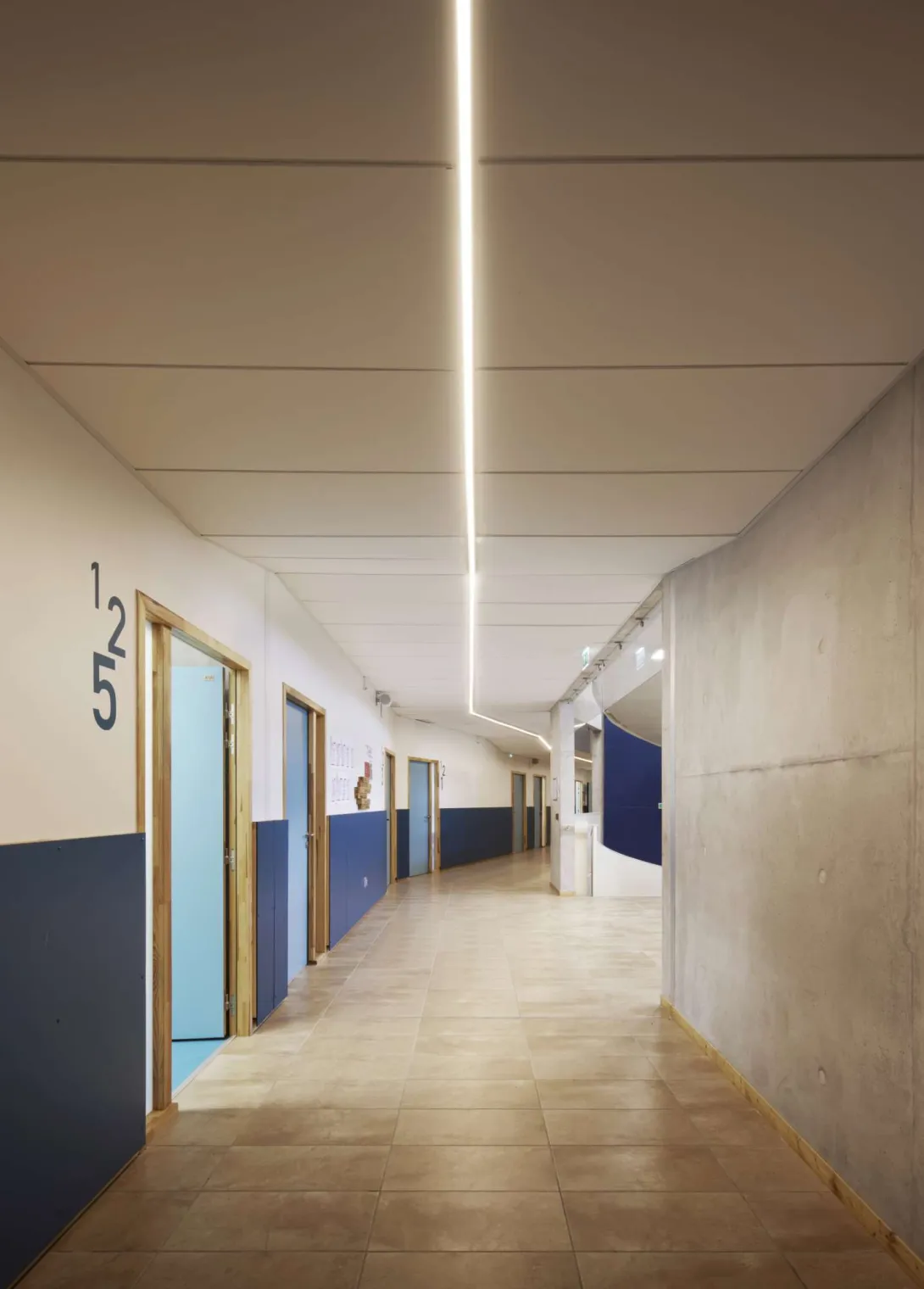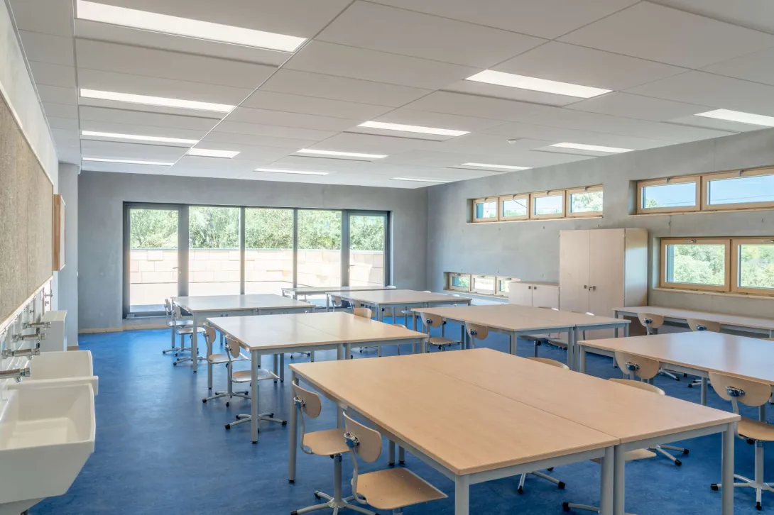 • Eclairage : LED, fluocompacte ; détecteur de mouvement dans les circulations et espaces extérieurs, commande manuelle dans les bureaux, automatique et manuelle dans les salles de classe (deux zones distinctes gérables indépendamment en fonction de l’éclairement naturel)