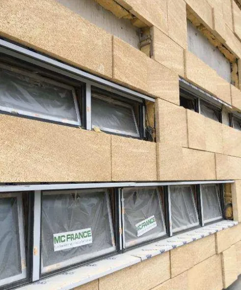 • R+1 et R+2 : béton bas carbone 20 cm / laine de verre 12 cm en isolation extérieure / parement pierre Pont du Gard