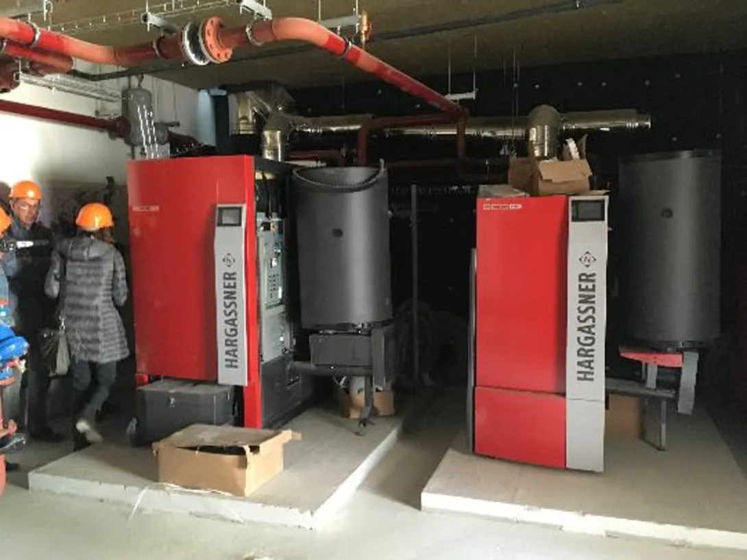 • Production : 2 chaudières bois granulés ; P = 200 kW + 90 kW ; 3 silos enterrés de 10 m3 chacun