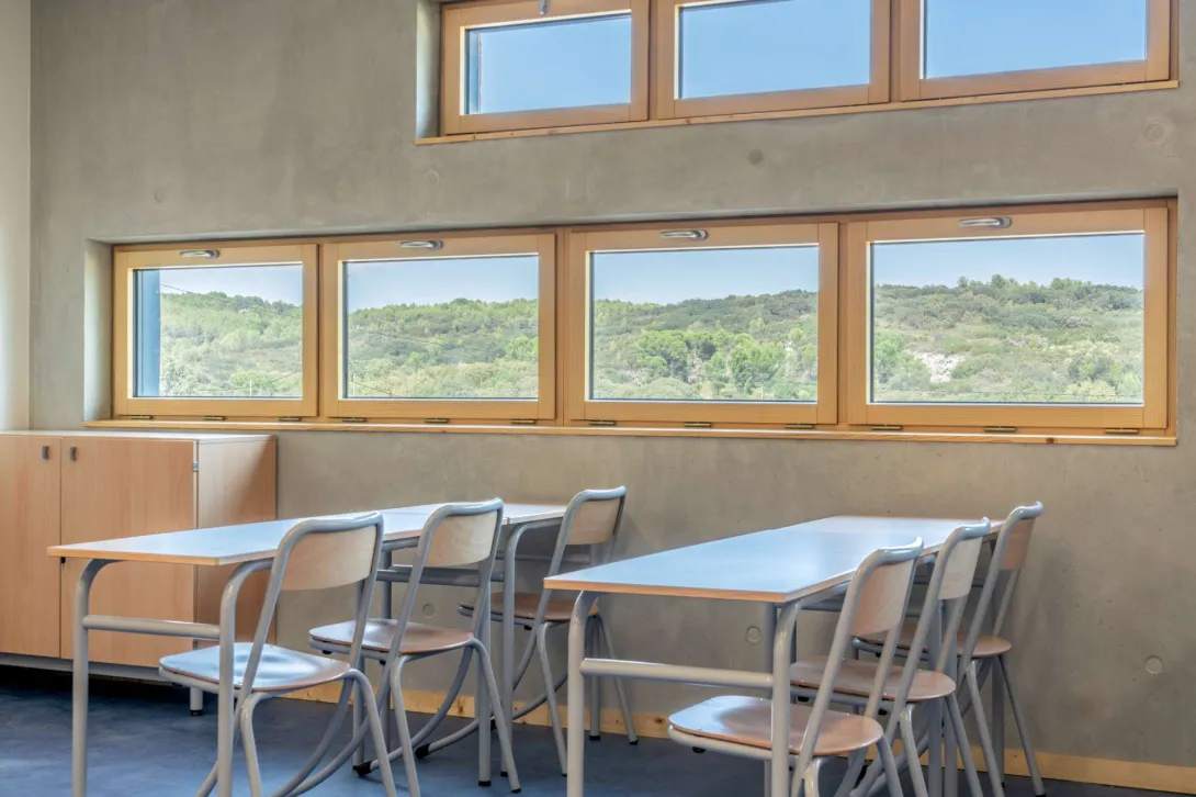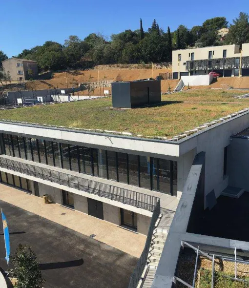 En termes d’équipements énergétiques, le choix a été fait de recourir à la biomasse pour le chauffage et de ne pas installer de système de climatisation. Une production photovoltaïque conséquente couvre la toiture du bâtiment d’enseignement tandis que celle de la demi-pension est végétalisée.