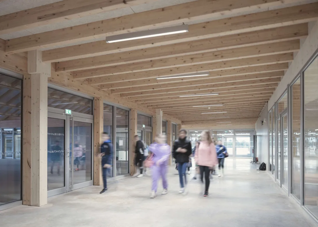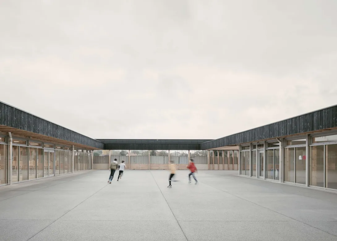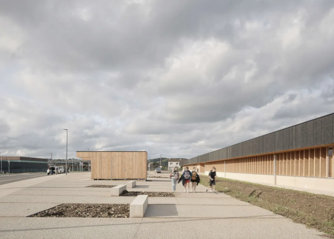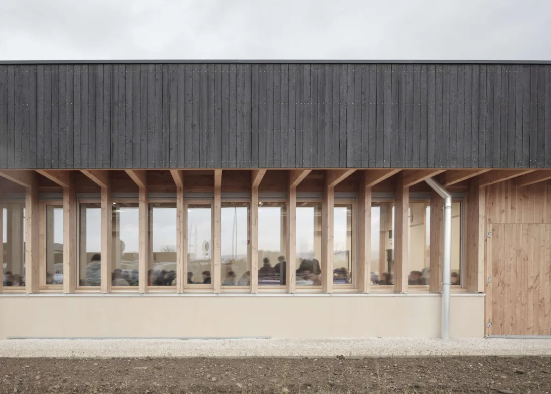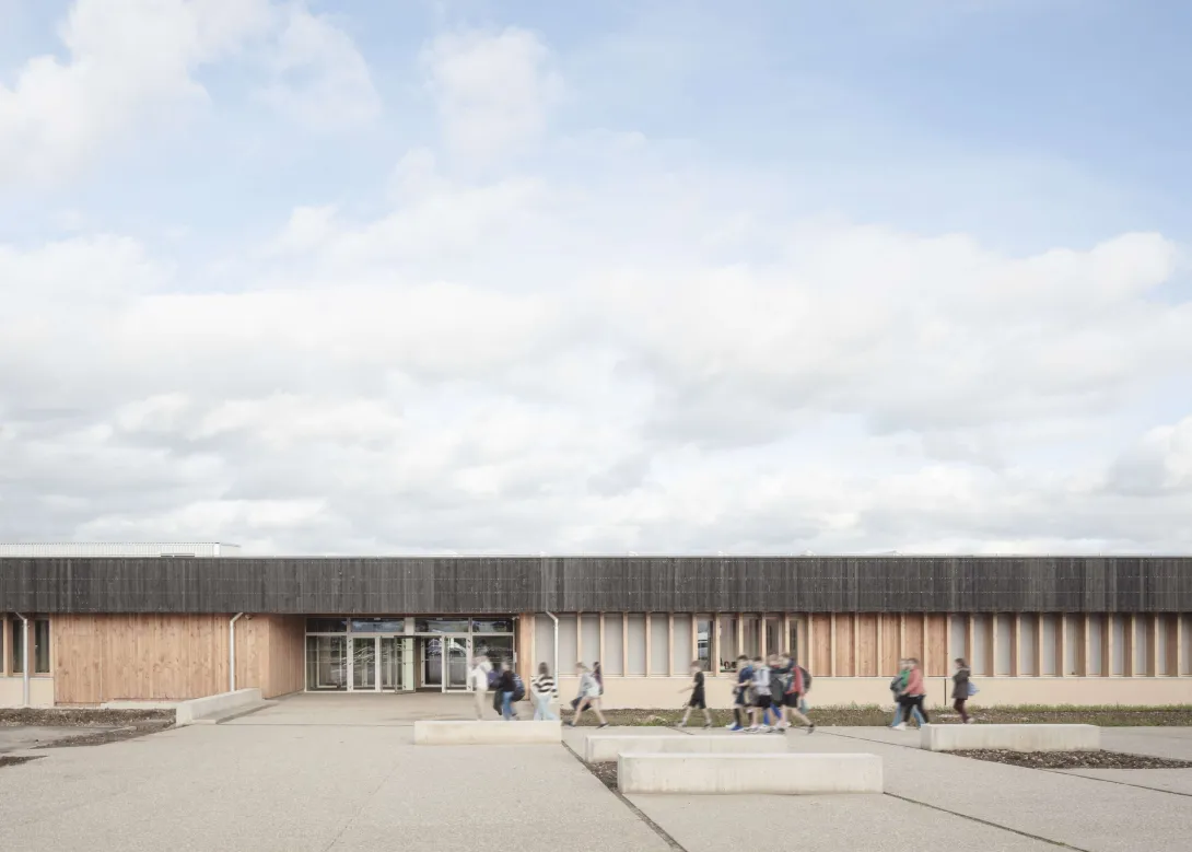 Il est conçu de façon bioclimatique, rythmé par de nombreux puits de lumière et baies vitrées, et fait la part belle au matériau bois, en structure, revêtement extérieur et aménagements intérieurs.