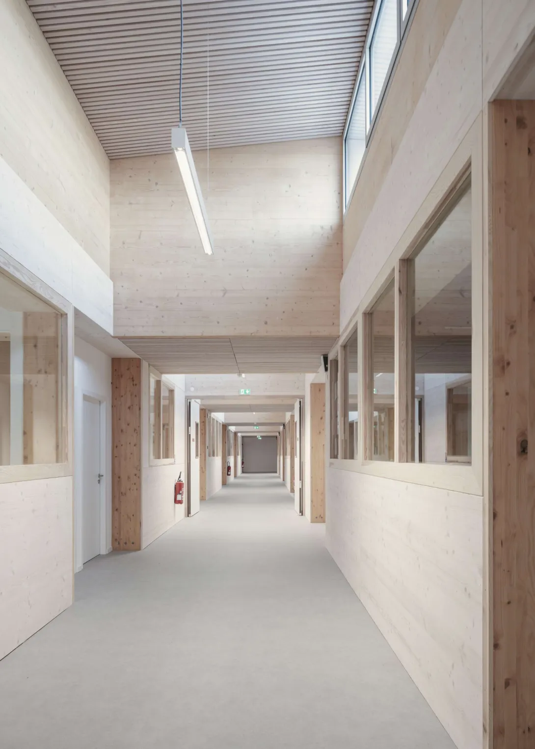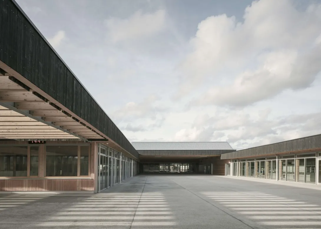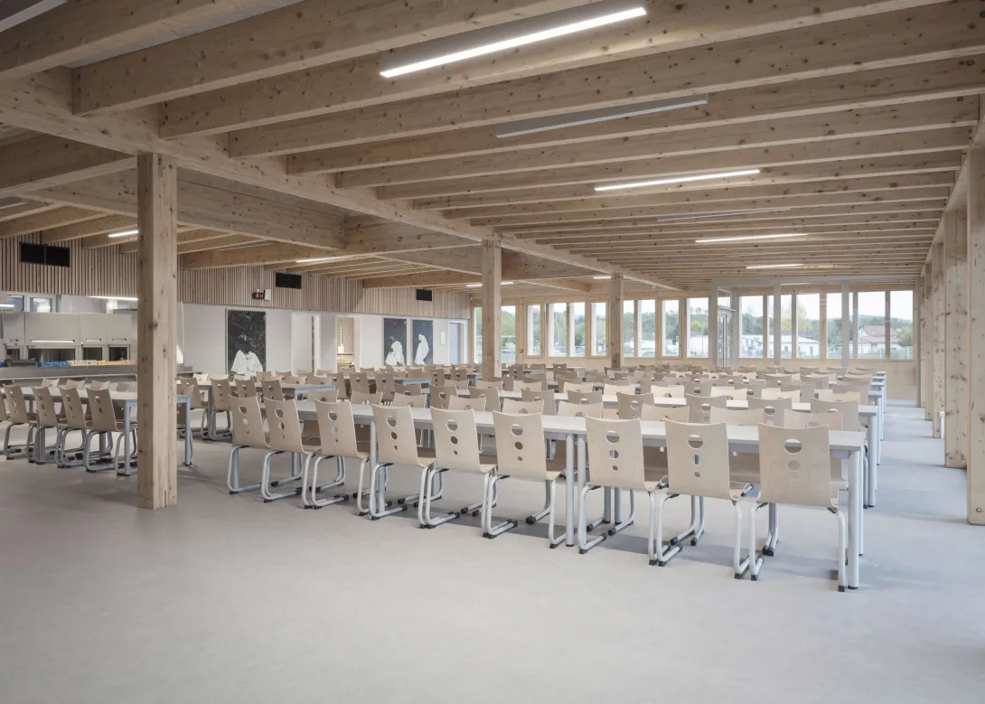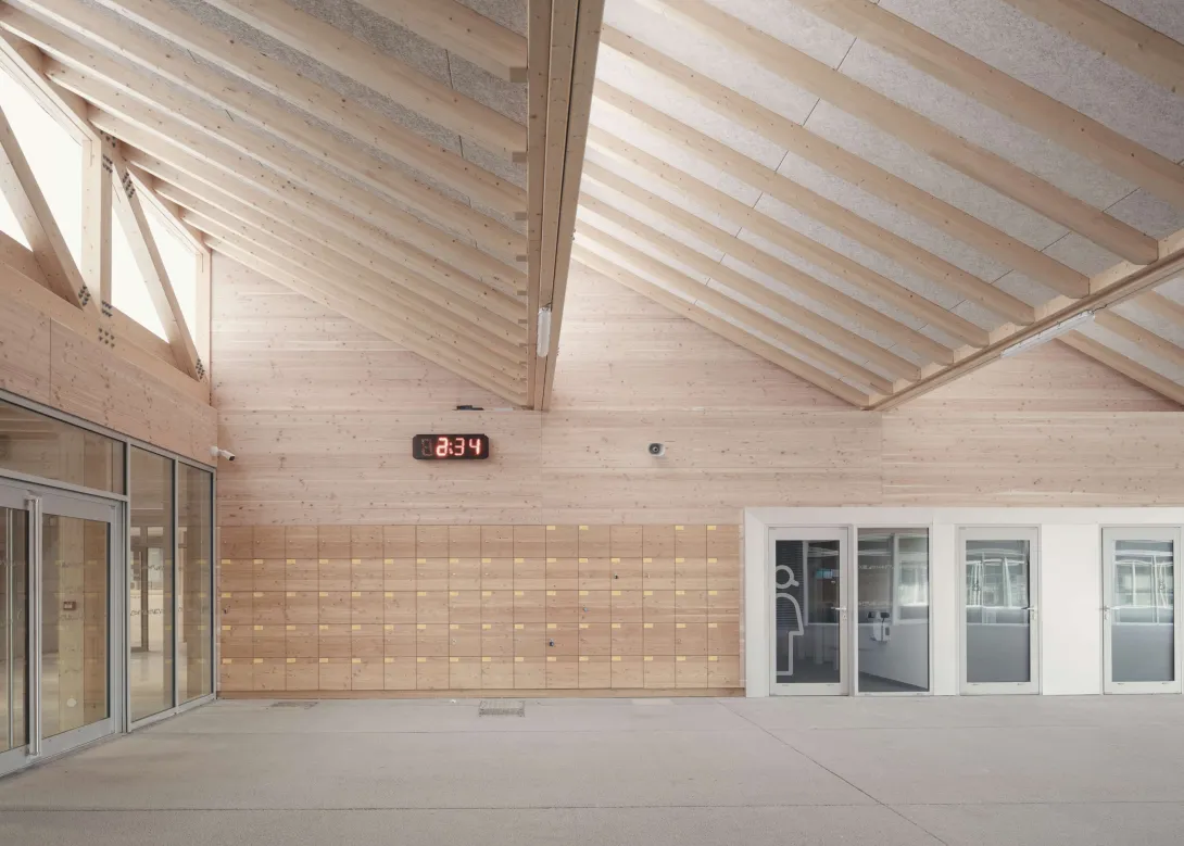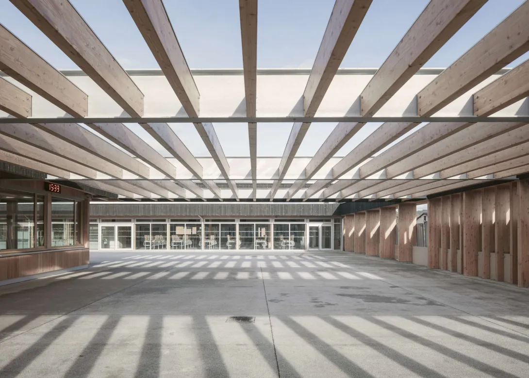 Il est conçu de façon bioclimatique, rythmé par de nombreux puits de lumière et baies vitrées, et fait la part belle au matériau bois, en structure, revêtement extérieur et aménagements intérieurs.