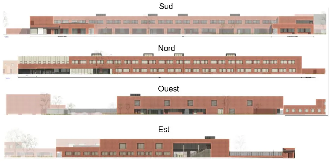 Le collège se déploie sur 2 niveaux suivant une forme en U de façon à être protégé des nuisances sonores et du vent dominant (Tramontane). Etroits, les bâtiments permettent d’être ventilés naturellement via la présence de lanterneaux en plafond des circulations. Le chauffage sera assuré par une chaufferie biomasse et le rafraîchissement par des batteries adiabatiques sur les centrales de traitement d’air.