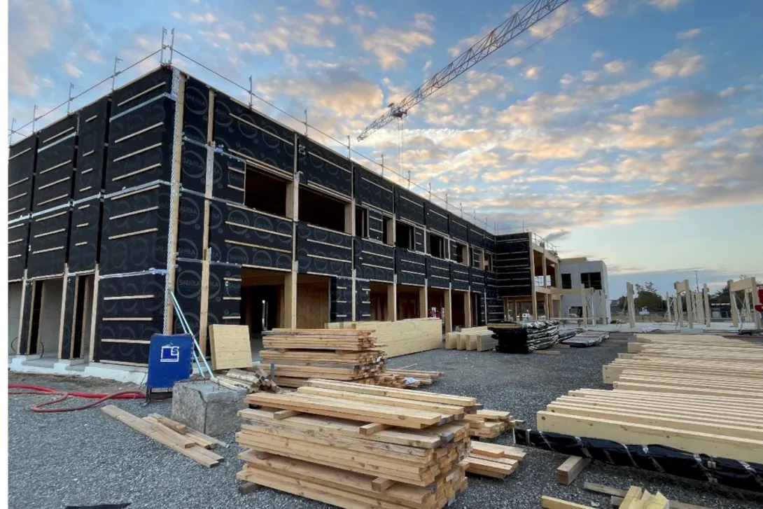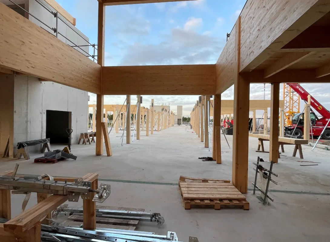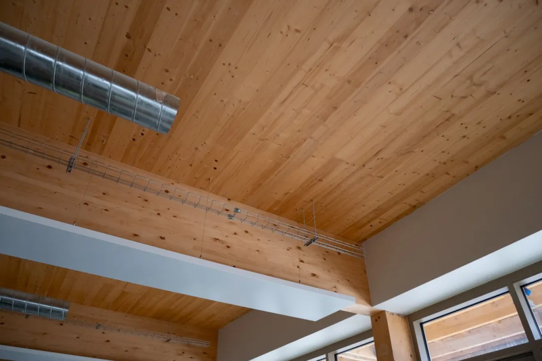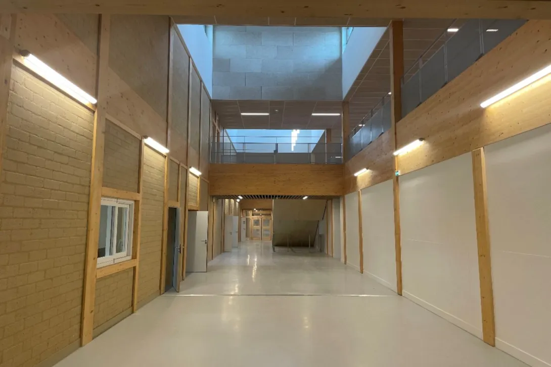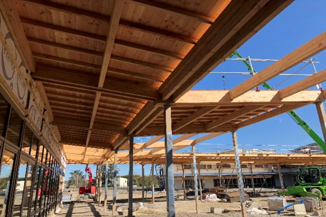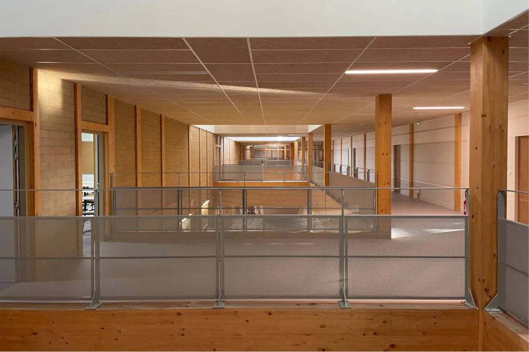 - Support photovoltaïque : panneau massif bois CLT (bâtiment d’enseignement) ou tôles acier nervurées sur support bois (bâtiment restauration) ; isolation laine de roche 26 cm ; étanchéité autoprotégée