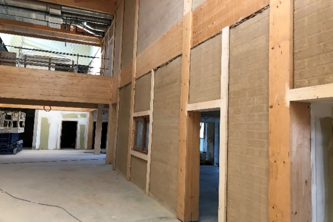 - Principal (RDC et R+1) : murs ossature bois isolés en paille (36 cm d’épaisseur) ; doublage intérieur laine de bois 6 cm ; finition extérieure enduit ou parement brique ou briquette