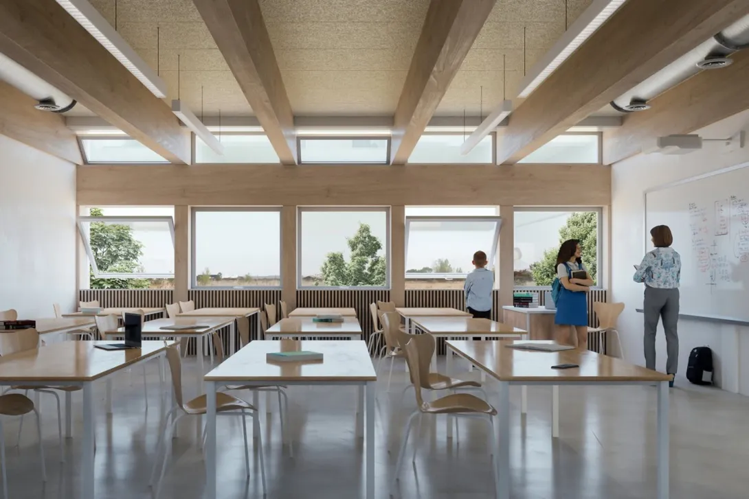 Le souhait de créer un bâtiment bas carbone est appuyé par la volonté d’avoir recours à des matériaux biosourcés, locaux et/ou de réemploi (bois en structure et isolation, terre coulée, briques de réemploi) et à une ventilation naturelle « low tech » dans les salles de classe (cheminées thermiques). Les énergies renouvelables seront présentes pour assurer le chauffage et le refroidissement (géothermie) et couvrir une partie des consommations électriques (photovoltaïque).