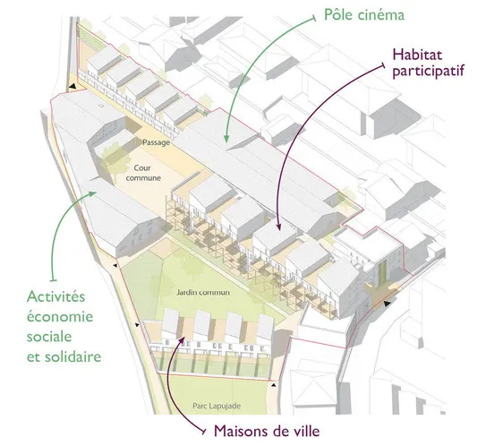 L’aménagement de l’îlot Lapujade, - Projet Herbes Folles et Habitat participatif Rosa Verda - associe Faire-Ville, le COL, l’équipe d’architectes AR357, l’agence Intercalaire, Cycles-RE qui représente le pôle Innovation avec un ensemble de structures de l’Économie Sociale et Solidaire (dont certaines déjà présentes sur le site) et la Forêt Électrique qui porte un projet de Pôle Cinéma.