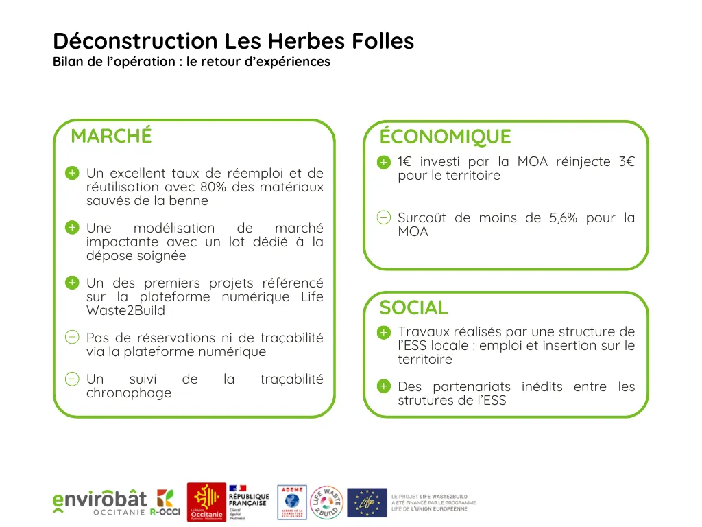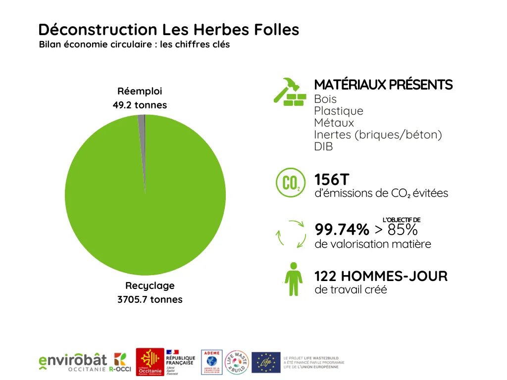 Ce projet intègre une démarche d’économie circulaire à travers le réemploi de ressources issues de la déconstruction. Il fait partie des chantiers expérimentaux de l’appel à projets Life Waste2Build.