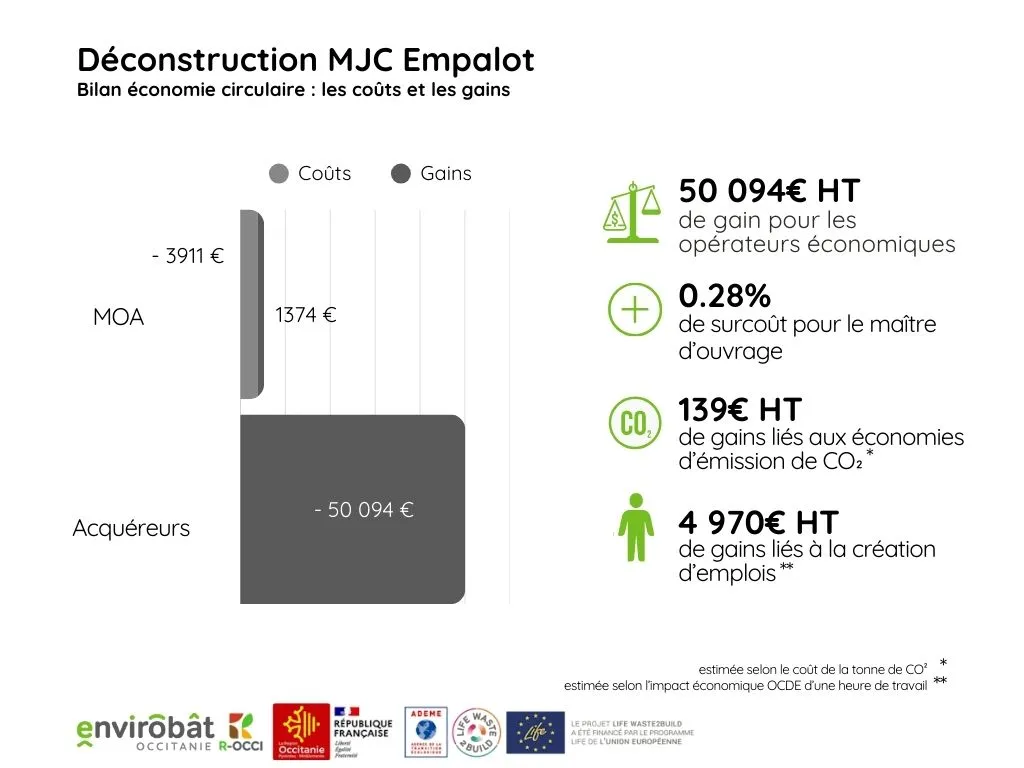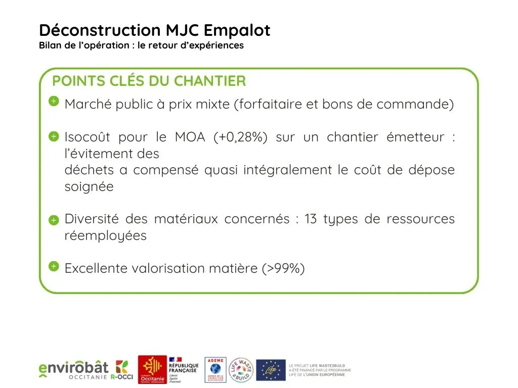 - un chantier à isocoût vertueux (+0.28%) : l’évitement des déchets a compensé quasi intégralement le cout de dépose soignée