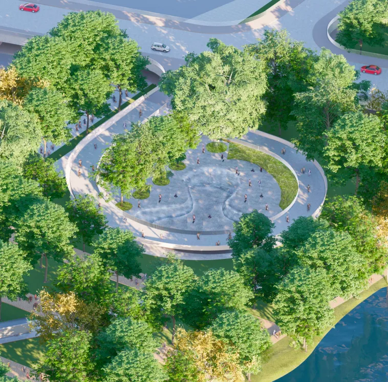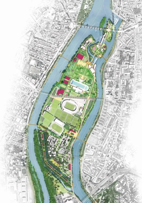 Programme : espaces publics, infrastructures (passerelles), aménagements paysagers et hydrauliques, parcs et jardins
