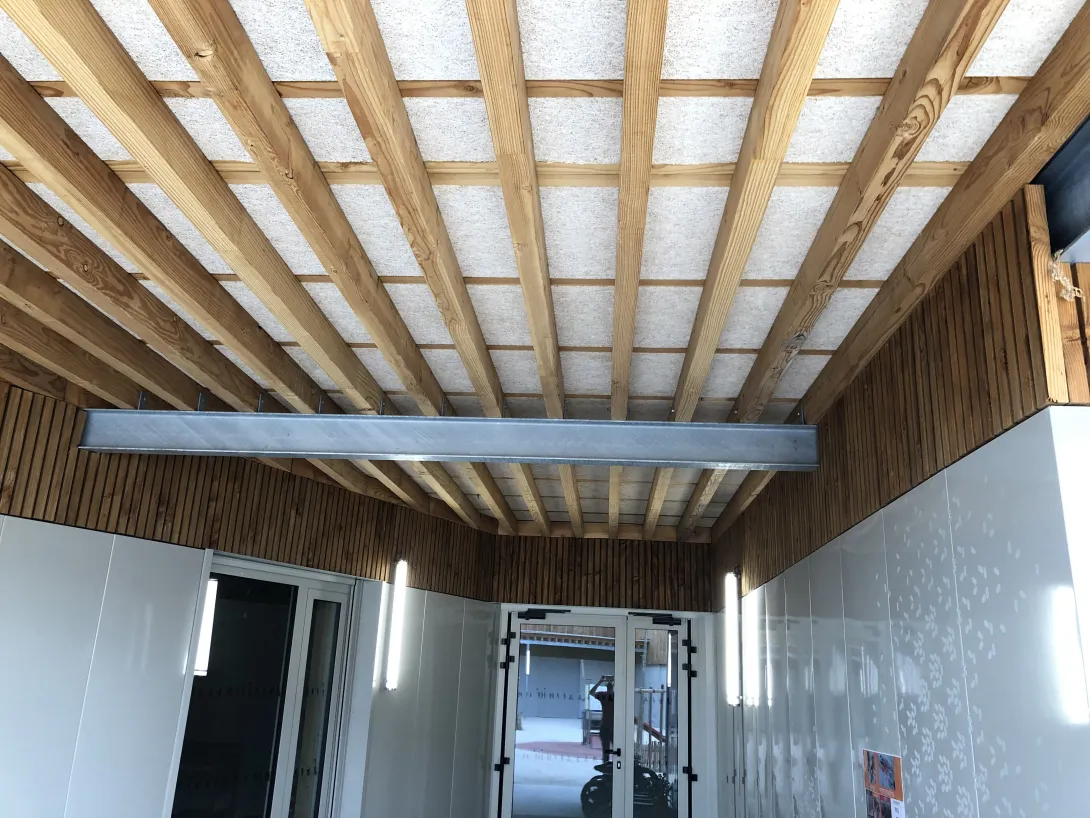 - Toiture bois : isolation laine de roche haute densité 24 cm sous membrane d’étanchéité sur panneau bois (R = 6,8 m².K/W)
