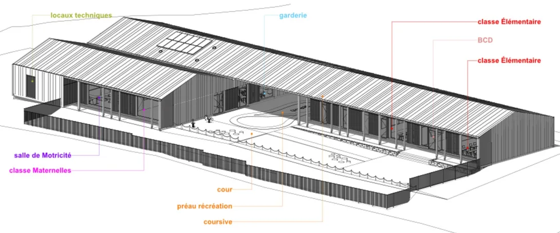 - Usages : 3 salles de classes (maternelles et élémentaires) pour 50 élèves, une salle de garderie, une salle de motricité, une salle de restauration, bibliothèque, locaux administratifs et techniques, parvis d’entrée / cour et préau