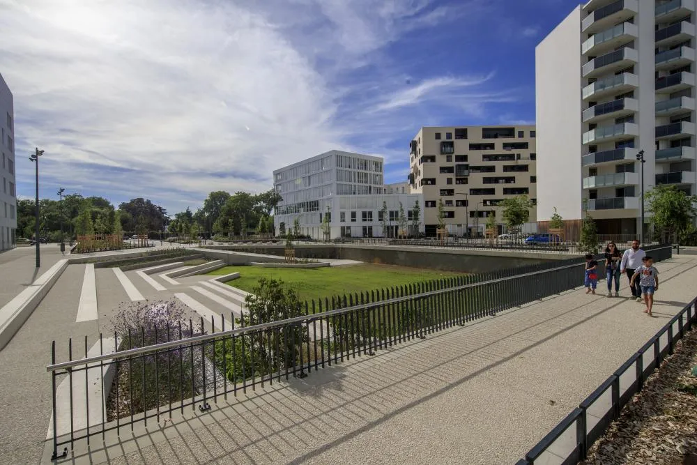 Le quartier est doté de plusieurs bassins de rétention relativement profonds qui se remplissent en période de pluie prolongée. Le paysagiste a souhaité connecter l’ensemble de ces ouvrages hydrauliques aux espaces végétalisés et écologiques à proximité du quartier. Vu du ciel, le Jardin du Barry, en cours de réaménagement, se prolonge dans le quartier. Certains de ces bassins prennent l’usage d’une aire de jeu et de détente lors de la pause méridionale comme par exemple la promenade des sports.
