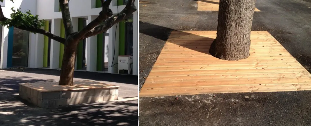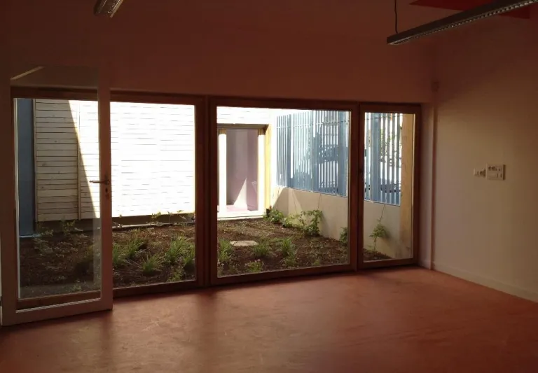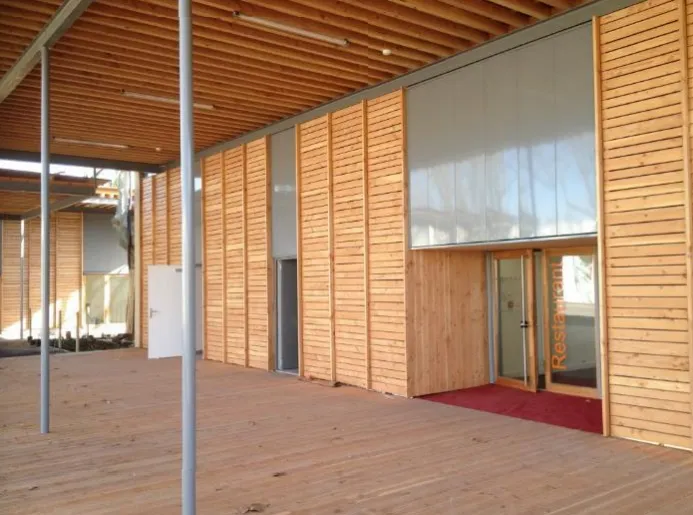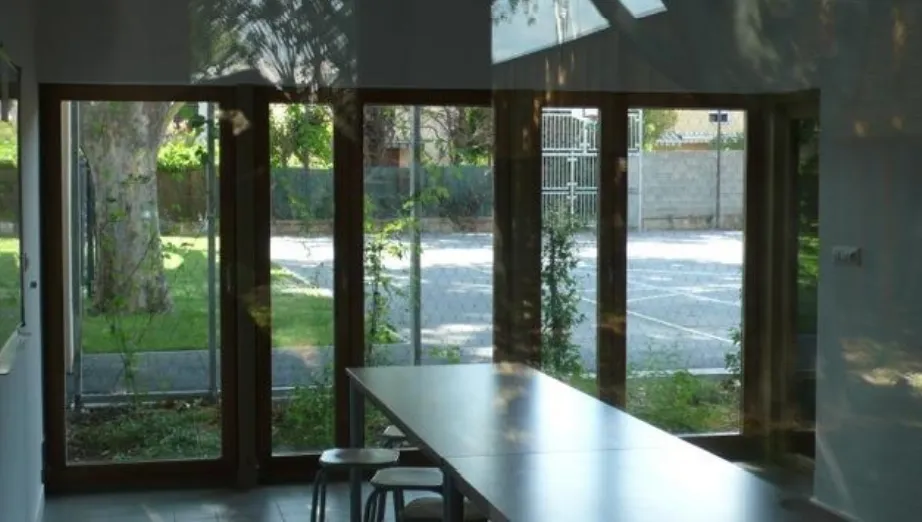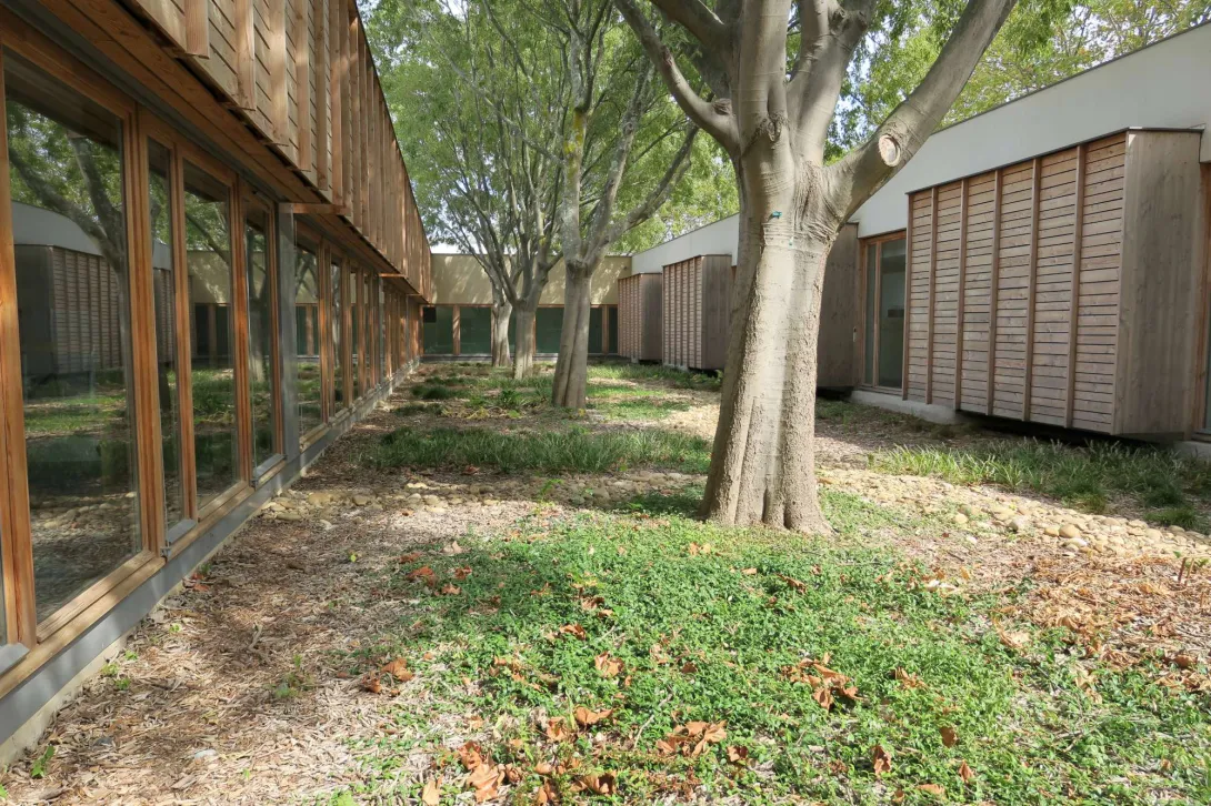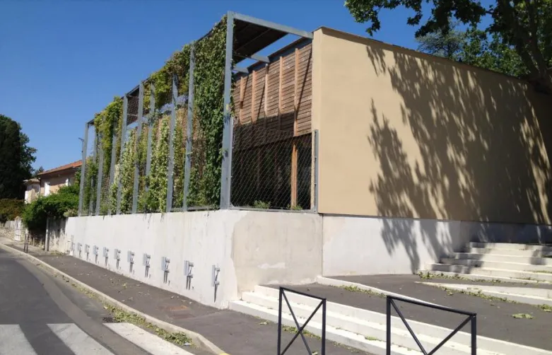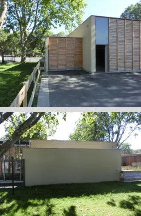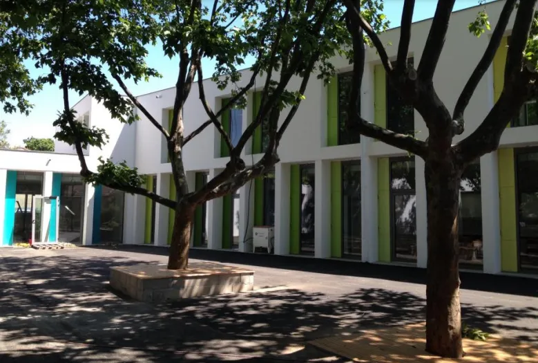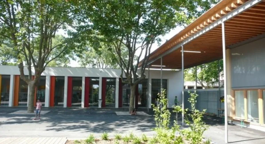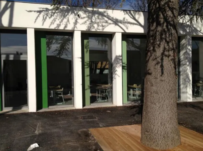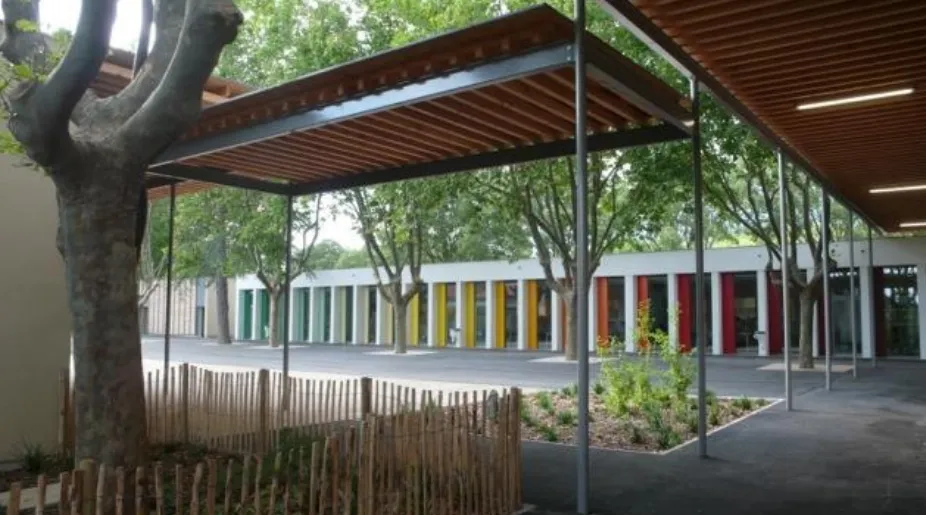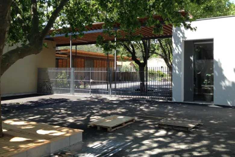 Situé au cœur d’un quartier périphérique de Nîmes, cette opération sur le groupe scolaire de Courbessac comprend un ensemble de réhabilitations et extensions. Les bâtiments existants sont de plain-pied, en béton standardisé des années 60. La première période des travaux a demandé aux élèves d’occuper des bâtiments modulaires temporaires prévus à cet effet, placés dans un jardin qui jouxte l’école. Pendant ce temps, les travaux de réalisation des extensions, restructuration partielle de l’existant et aménagements extérieurs se sont déroulés, et se sont terminés en 2014. La deuxième période, prévue à la restructuration de l’école existante s’est achevée en 2016. Deux bâtiments neufs ont ainsi été créés : l’un abritant l’accueil loisir associé à l’école, l’autre le réfectoire. Les bâtiments sont reliés les uns aux autres par des préaux. Le bois occupe une place centrale dans le projet (en structure de toutes les extensions/constructions neuves, en bardage, platelage, revêtement intérieur, dessous de toits, menuiseries et une partie de l’isolation).