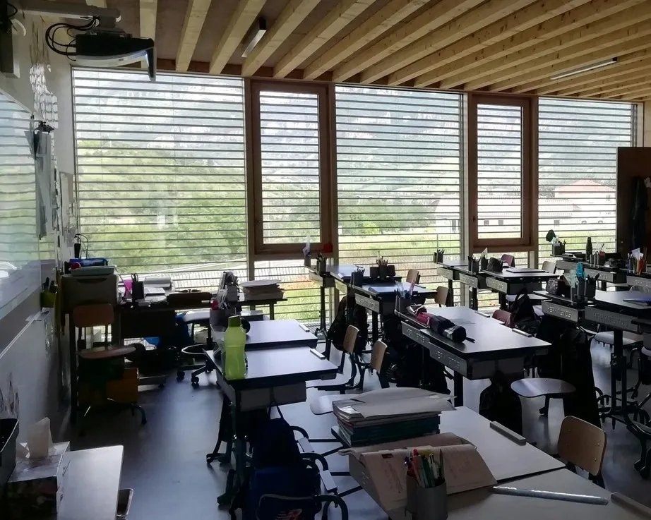 • commande manuelle et arrêt par détection d’absence dans les salles de classes avec gradation en fonction de la luminosité naturelle