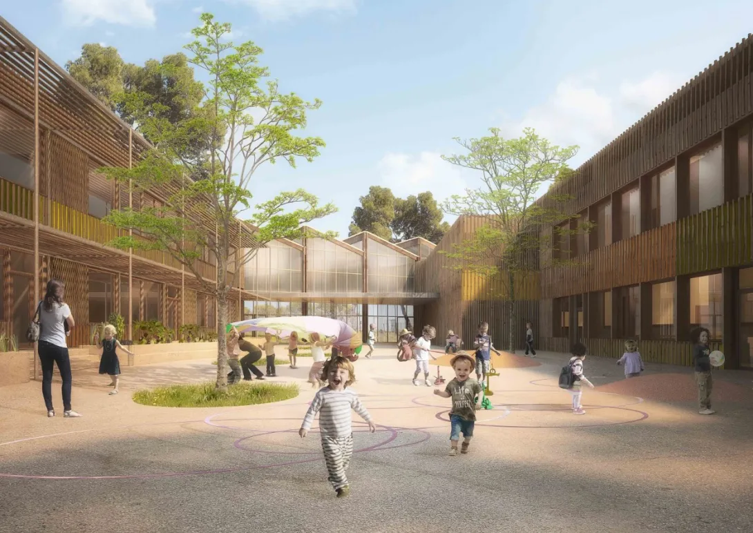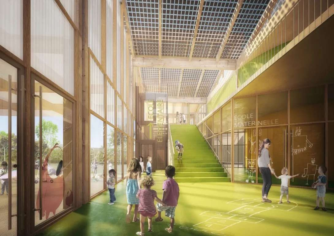 Dans une démarche globale de transition énergétique et de développement durable, la ville de Juvignac a soulevé la nécessité de construire un nouveau groupe scolaire pour répondre aux besoins. Celui-ci comprend un bâtiment en R+1 constitué de 3 volumes, deux pour les scolaire et un pour le tiers-lieu, reliés par une passerelle.