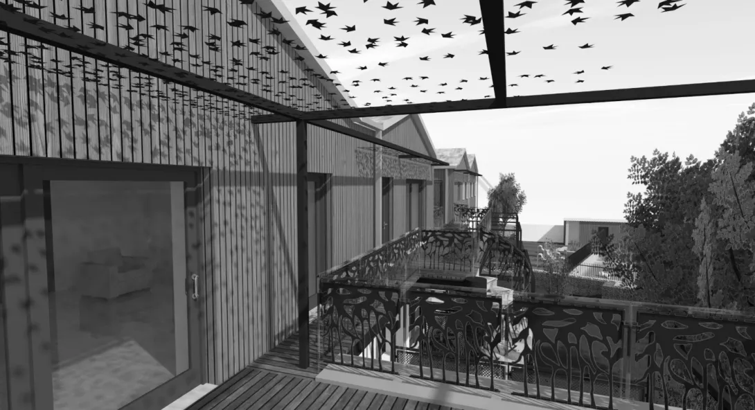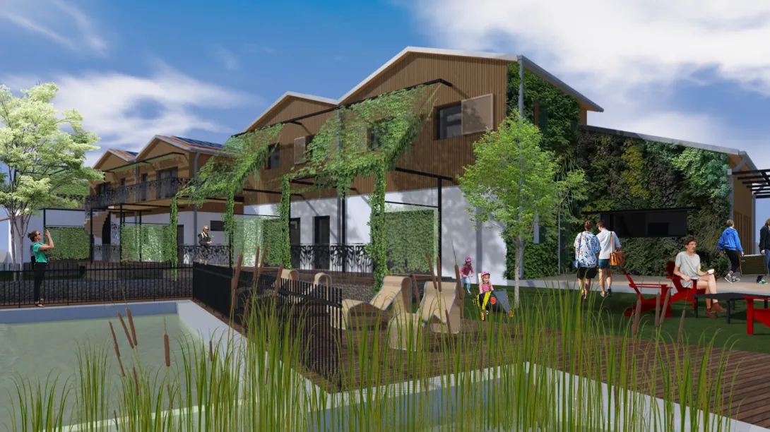 Le projet architectural comprend l’aménagement des espaces partagés de façon concomitante (un jardin, un petit potager en permaculture, un bassin de baignade naturel, des chambres d’amis, une salle commune, une buanderie, un atelier).