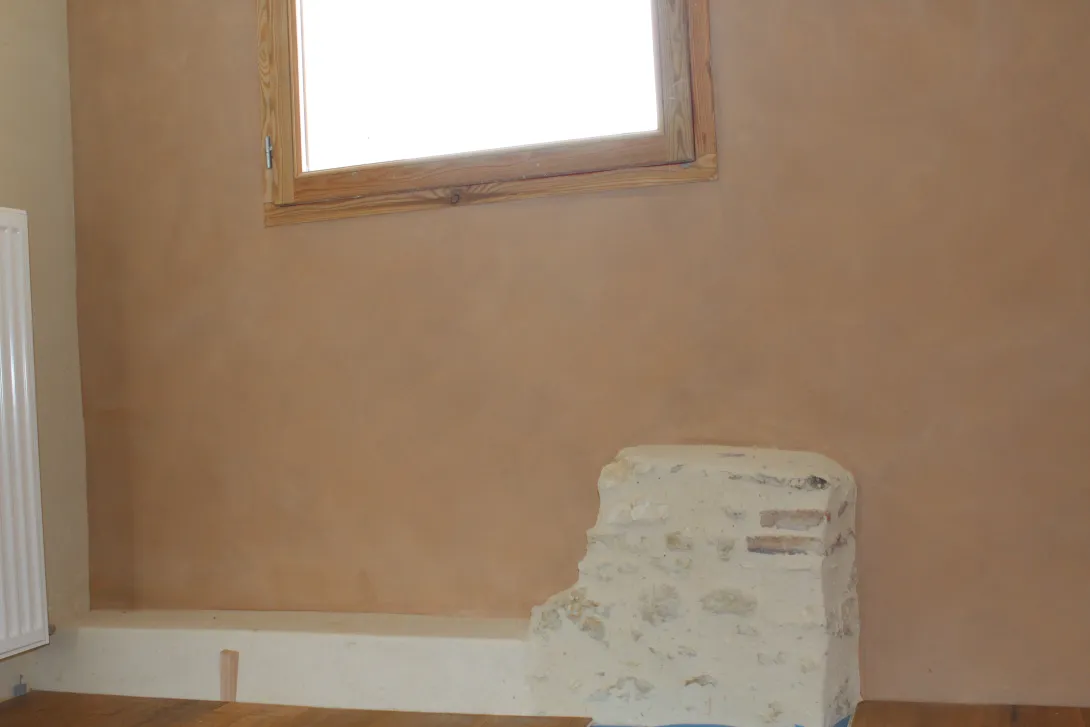- Murs existants en pierre isolés par l’extérieur en fibre de bois (R= 5,1 m².K/W) ou conservés avec enduit intérieur chaux-chanvre 4 cm (R= 0,84 m².K/W)