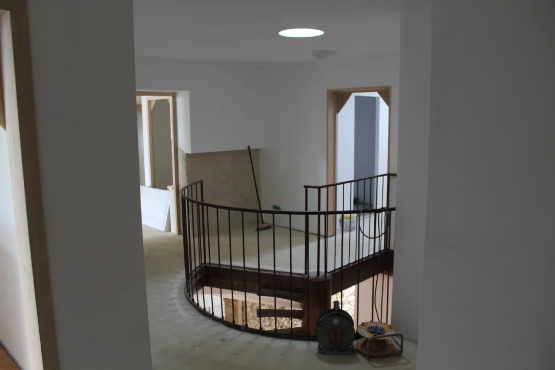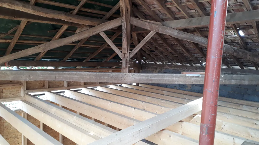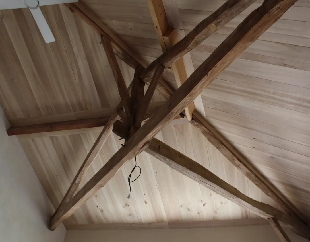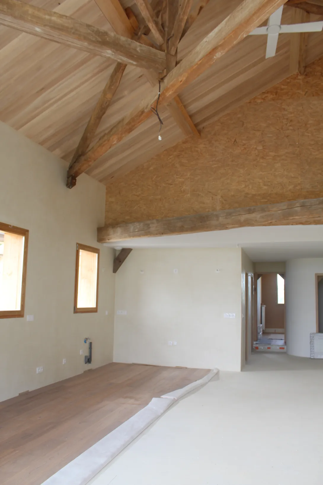 - Charpente et couverture : charpente bois conservée (2/3) et neuve (1/3) ; isolation par caissons de ouate de cellulose et complément fibre de bois (R = 6 m².K/W)
