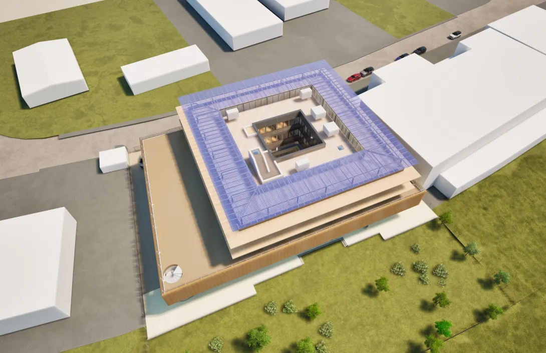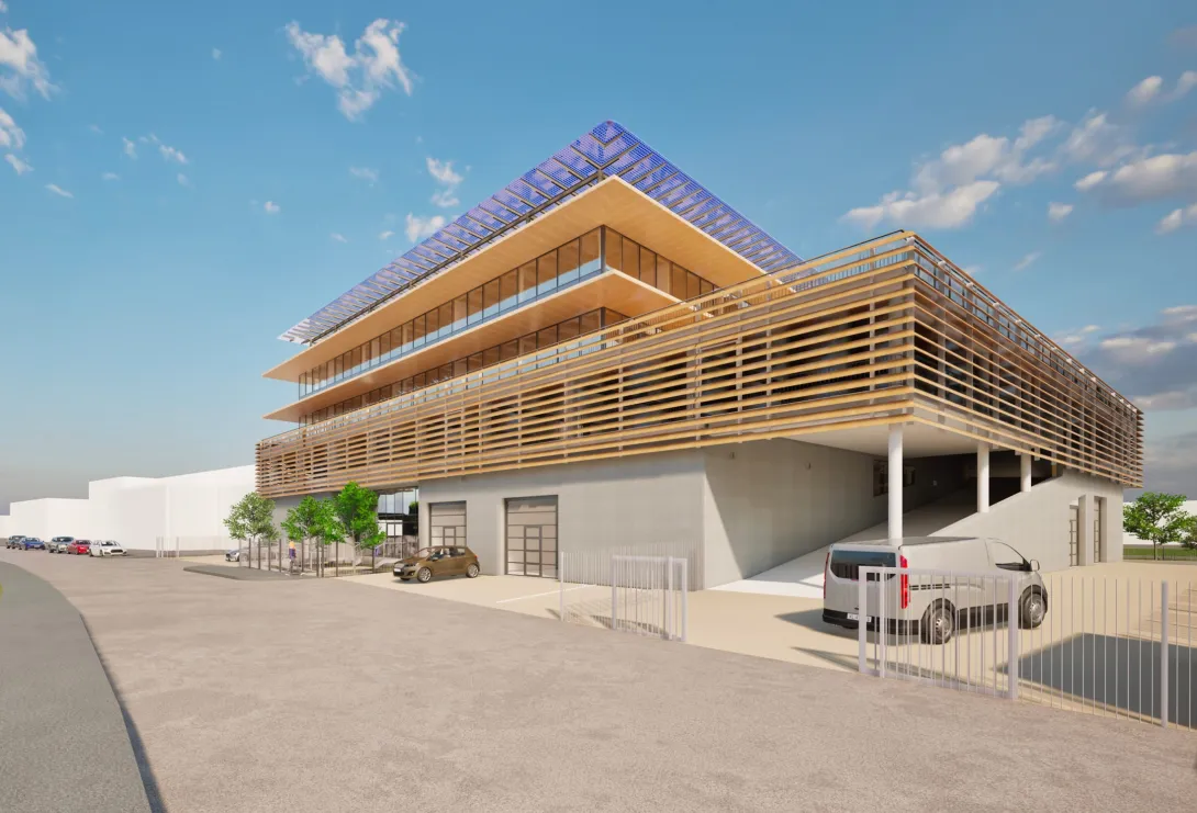 Le projet se compose d’un bâtiment compact sur quatre niveaux, avec des ateliers au rez-de-chaussée, un niveau de parking en superstructure au R+1 et des bureaux aux étages supérieurs, qui remplacera un bâtiment existant très vétuste et inadapté aux usages souhaités.