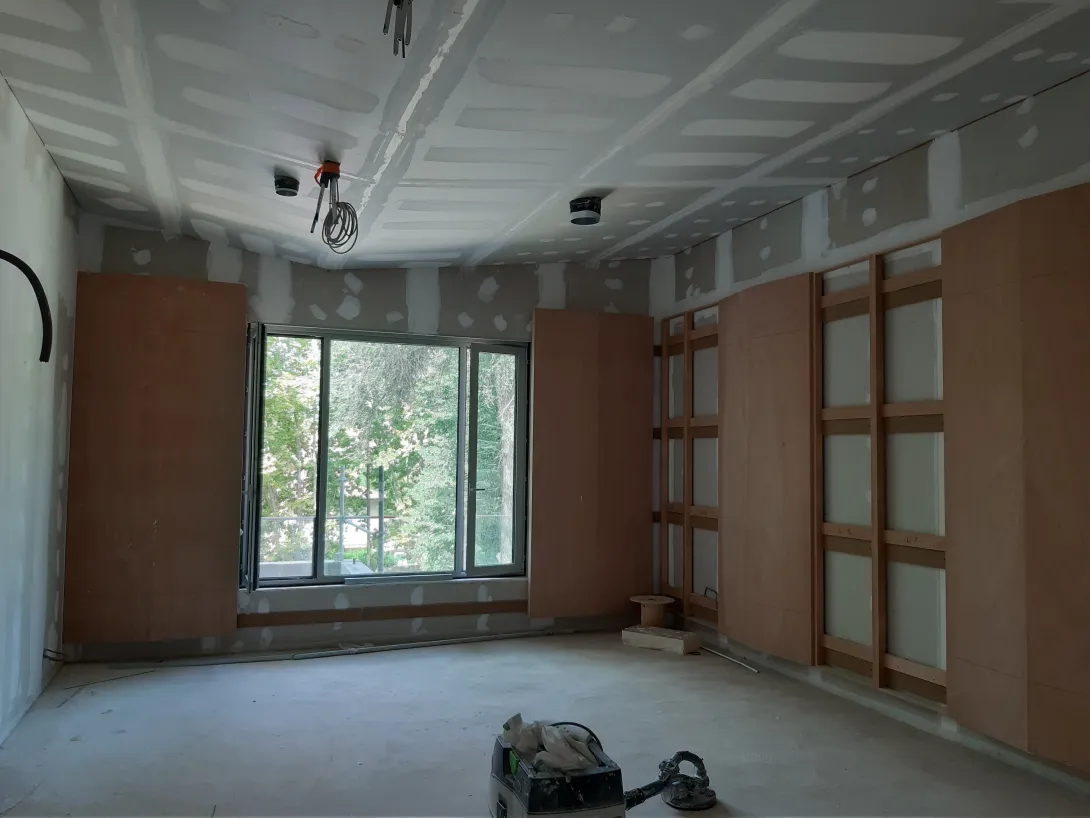 - Sur extérieur : isolation laine de roche 14 cm sous dalle béton et isolation laine de bois 9 cm entre lambourdes sous parquet en bois massif (R = 3,2 m².K/W)
