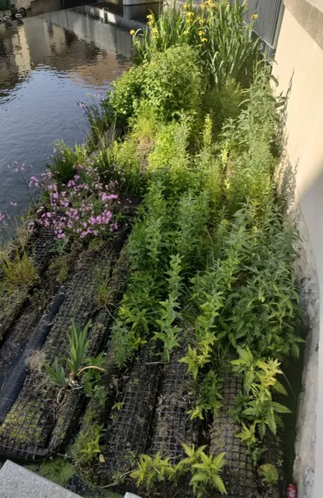 - une attention a été portée à la biodiversité, avec un calcul du coefficient de biotope (CBS) qui s’est amélioré avant et après les travaux. Accompagnés par Ecocéan, bureau d’études spécialisé dans le génie écologique marin, l’entreprise Les Arts verts a installé des jardins flottants sur le rivage, arrimés par des câbles en inox au quai. Grâce à leurs flotteurs, ils amortissent les vagues et montent et descendent en fonction du niveau du Pipié, dont le régime est torrentiel. Lors de la crue de 2022, les jardins flottants ont bien rempli leur fonction et n’ont pas subi de dommages.