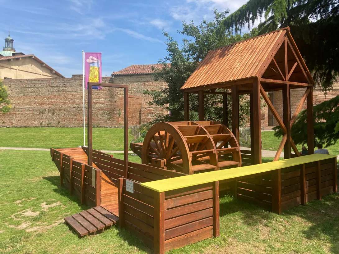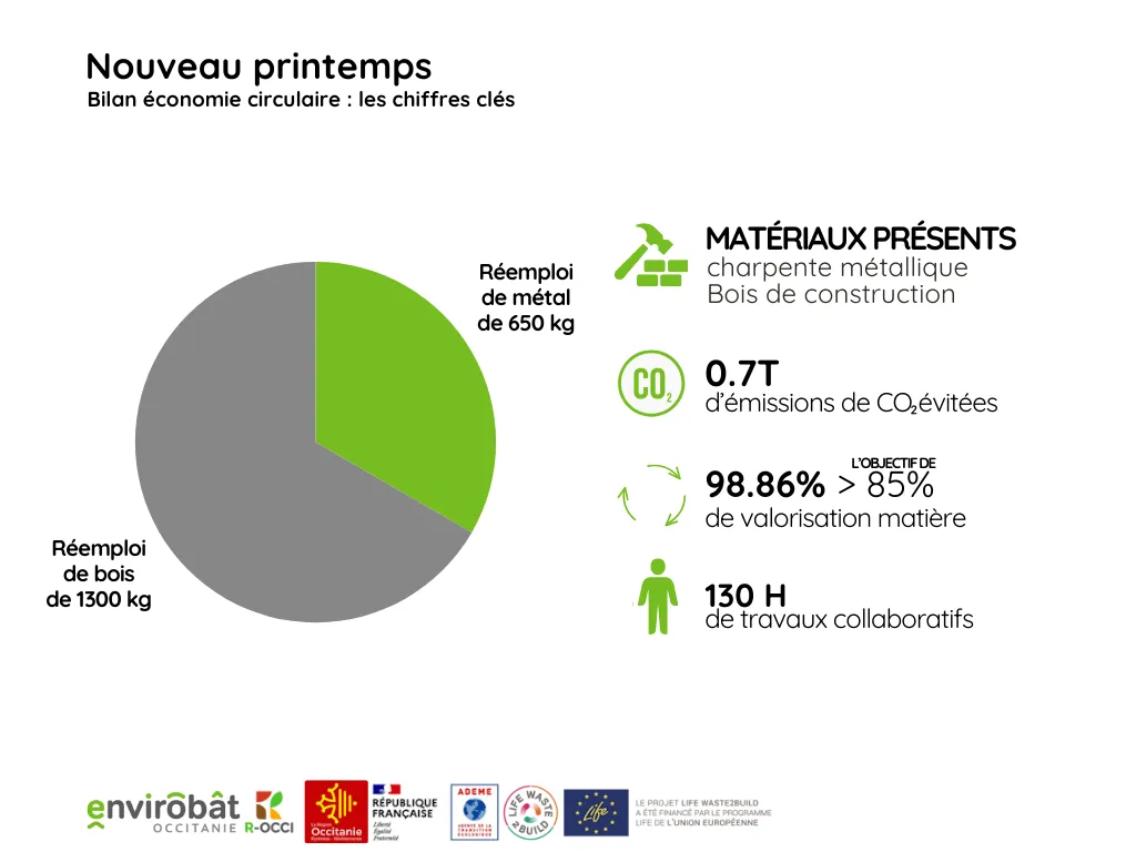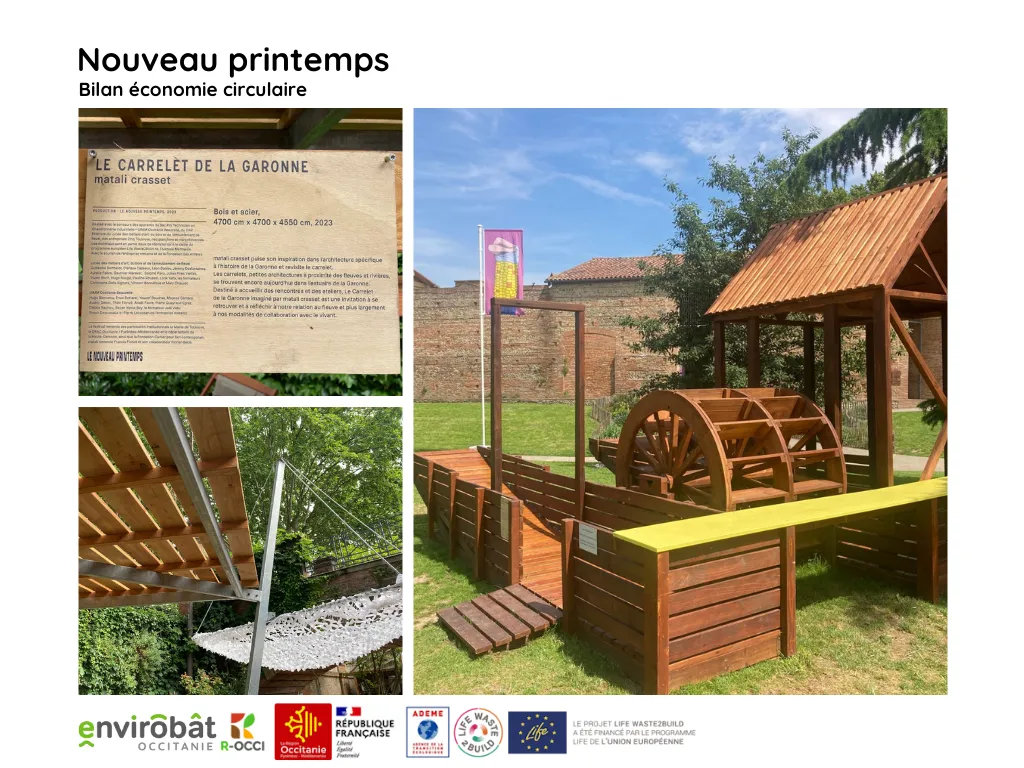 • 1300 kg de bois issu du chantier de déconstruction du gymnase Daste et de la déconstruction de l’exposition des Jacobins réemployé sur l’œuvre du « Moulin à Nef » par l’association 3,14 conception en partenariat avec les étudiants en menuiserie du lycée Urbain Vitry (fabrication de la roue).