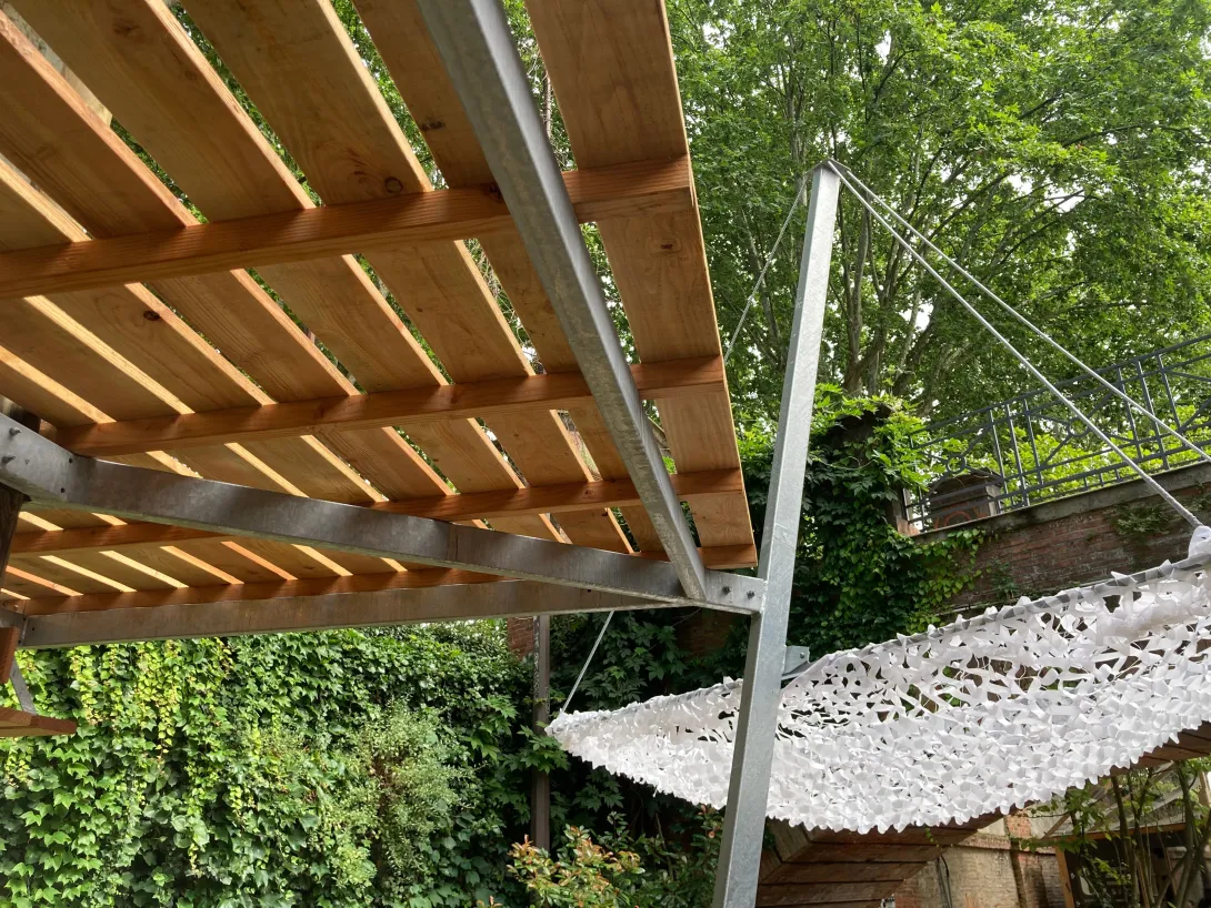 • 650 kg de métal issue de la charpente métallique du chantier de déconstruction du gymnase Daste réemployé sur l’œuvre du « Carrelet » par Metamo en collaboration avec le pôle formation UIMM de Beauzelle (partie métal) et le lycée des métiers d’art de Revel (partie bois).
