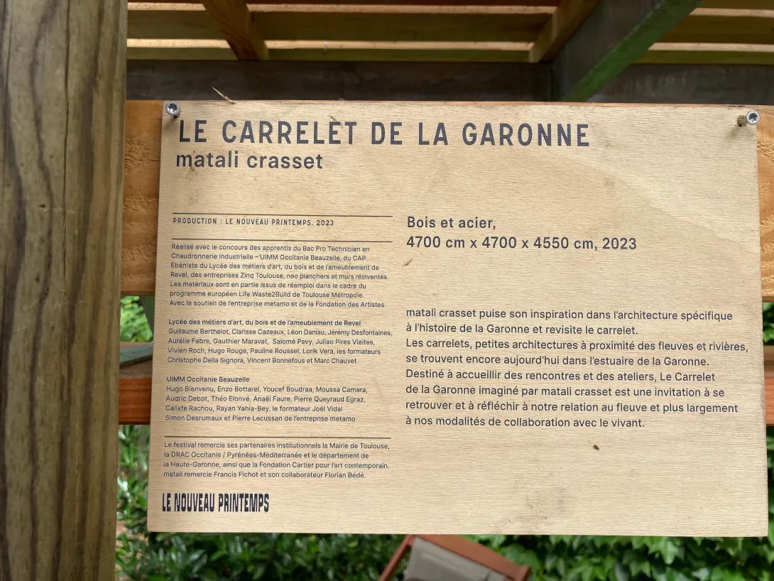 Les deux oeuvres concernées par le réemploi et imaginées par l’artiste sont une invitation à se retrouver et à réfléchir à notre relation au fleuve et plus largement à nos modalités de collaboration avec le vivant : Le carrelet de la Garonne et le Moulin à Nef.
