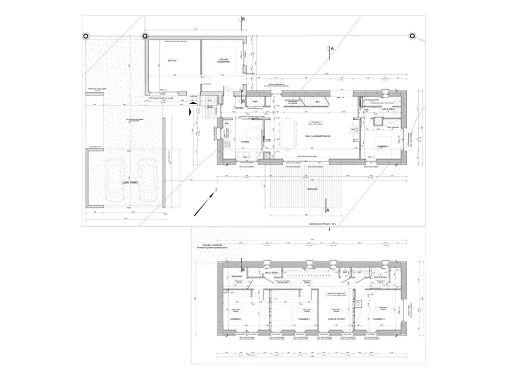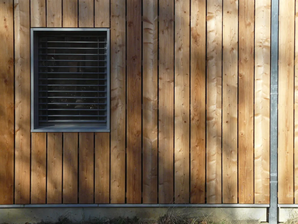 - Charpente et couverture : Ossature bois, isolation paille, bardage en mélèze, structure en poteaux continus entre les 2 niveaux (balloon frame), toiture végétalisée