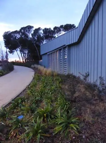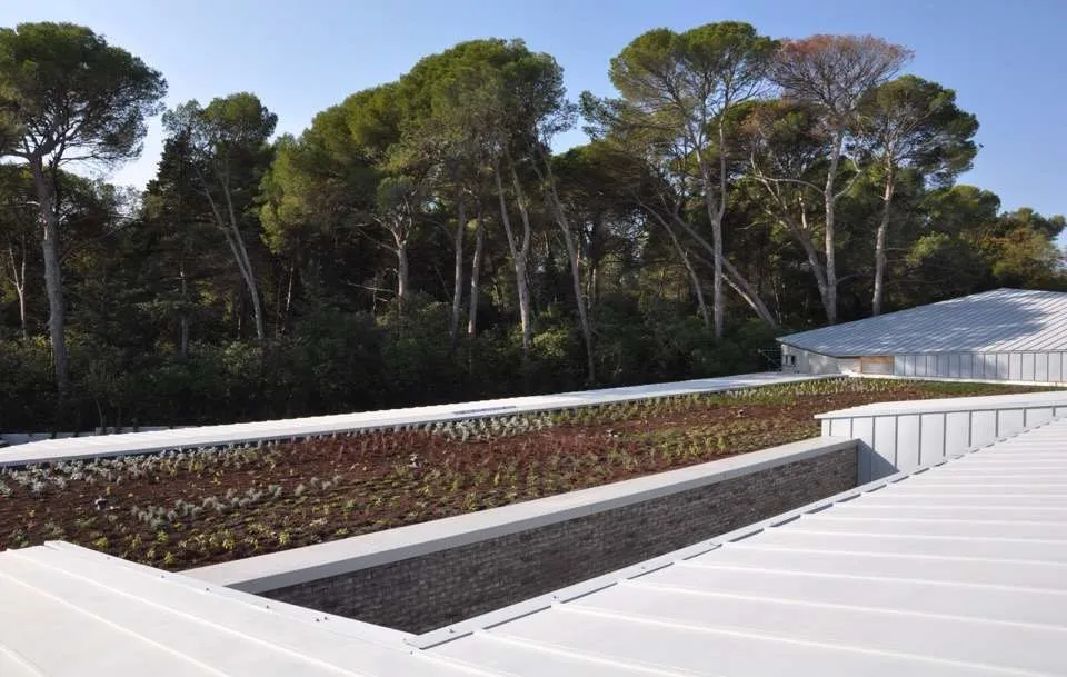 A proximité directe de pins parasols, le bâtiment prend le parti du paysage et est végétalisé.