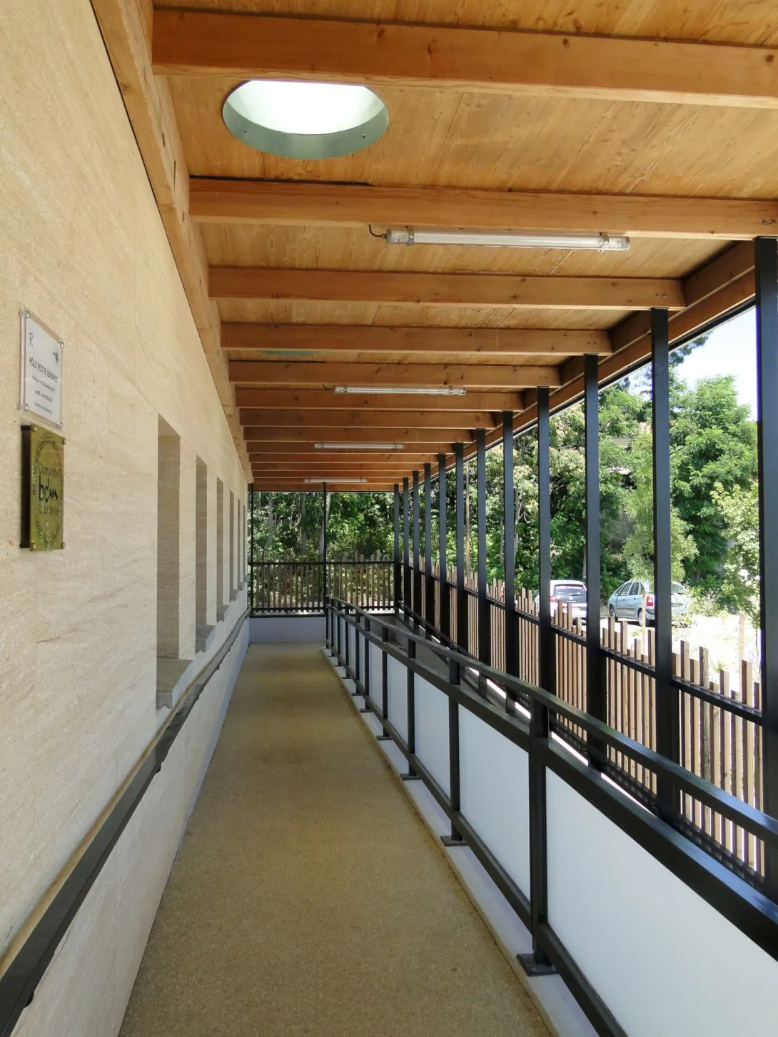 Porté par une commune et une équipe pédagogique soucieuse de réaliser un projet exemplaire en terme de confort, d’usage et de développement durable, le bâtiment fait la part belle aux matériaux locaux à faibles impacts environnementaux et sanitaires (pierre massive, bois, isolation en bottes de paille, enduits en terre) et vise l’autonomie énergétique.