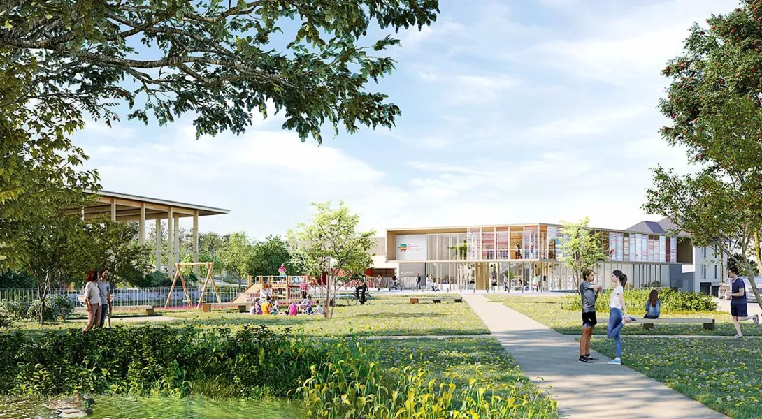 Le projet s’accompagne de la création d’un parc arboré en lieu et place de l’ancien parking (6000m²). Il accueillera un bassin, des jeux d’enfants, un city-stade et le boulodrome existant. Le parc, tout en proposant des espaces extérieurs de qualité, participe à la réorganisation des flux et au lien avec le bourg.