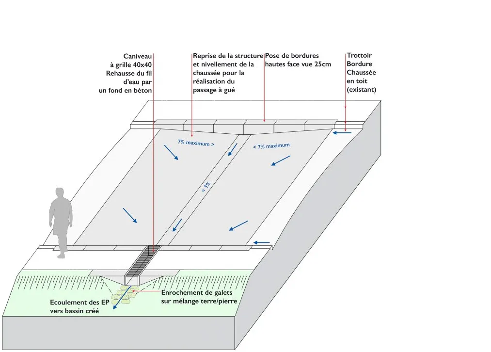 Dans le cadre de cette opération le SIVOM SAGe a conçu un projet visant à promouvoir une gestion intégrée et durable des eaux pluviales, avec des solutions alternatives au « tout tuyau » et réfléchi à l’échelle d’un bassin versant. Par cette approche innovante, il a fait le choix de privilégier une gestion à la source, en optant notamment pour des techniques d’infiltration naturelle, de stockage ou de rétention.
